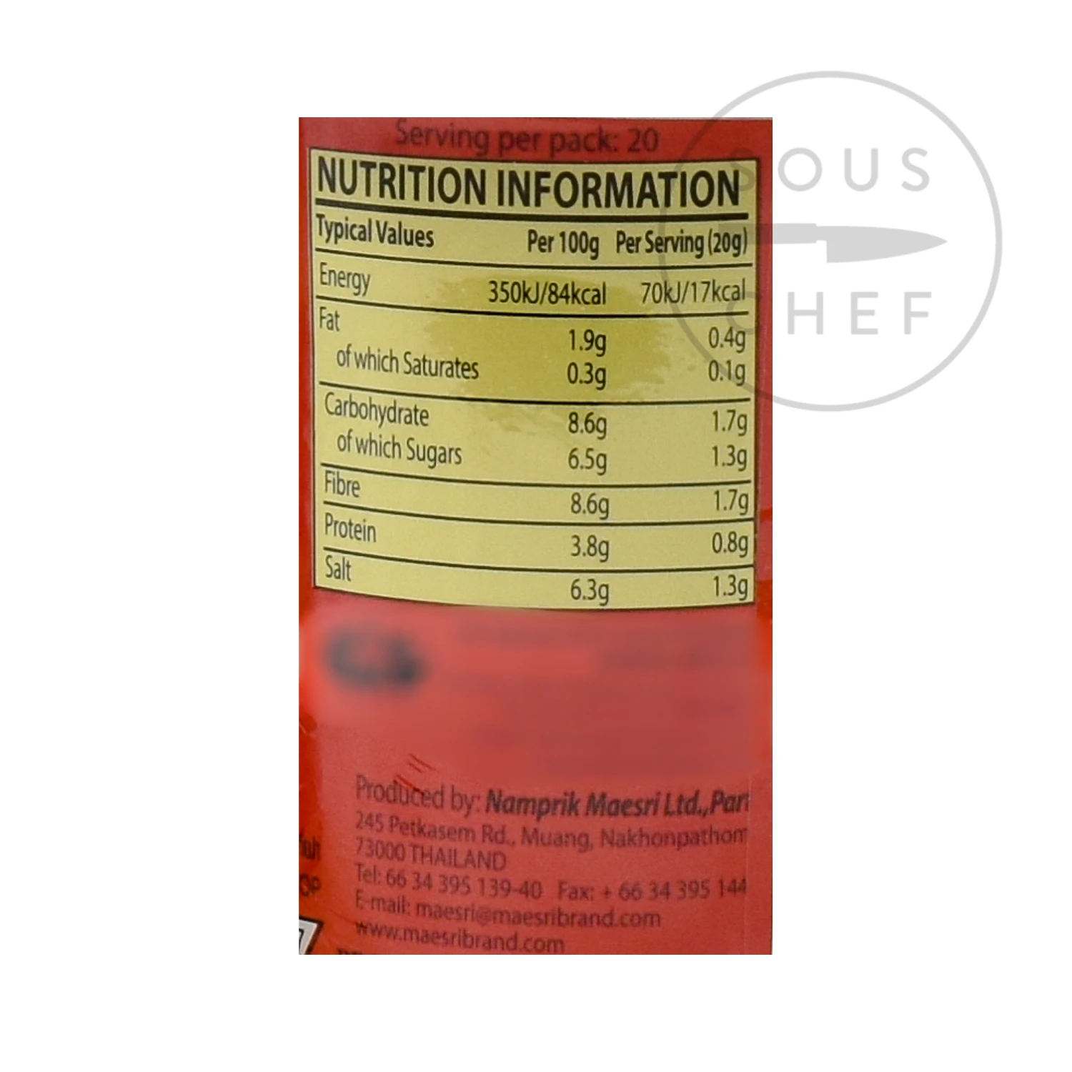 Ingredients: Dried red chillies 35%, garlic 25%, shallot 20%, salt 7%, lemongrass 6%, sugar 3%, kaffir lime 2%, galangal 1%, spices 1% (coriander seeds, cumin, cardamon)