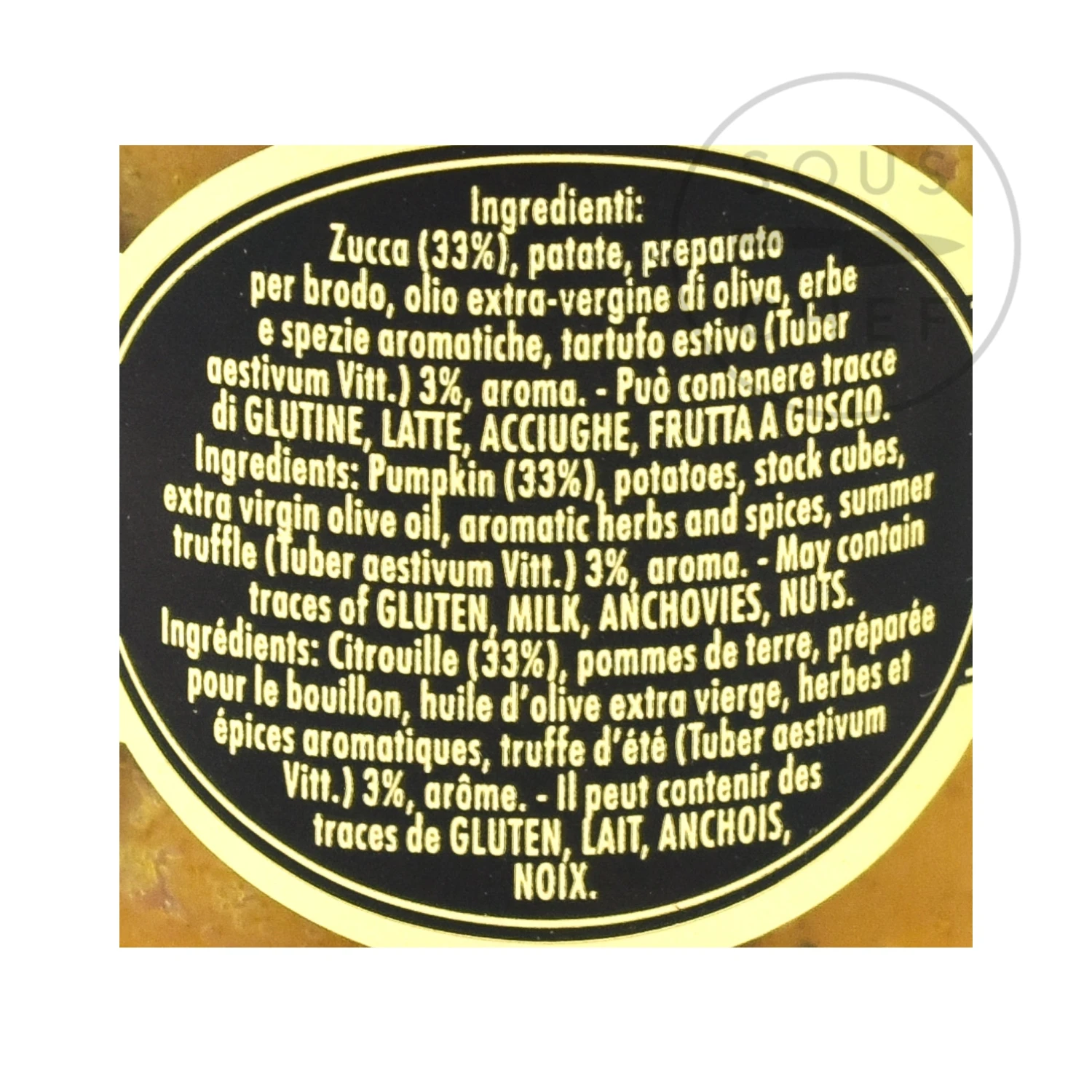 Ingredients: pumpkin (33%), potatoes, stock cubes, extra virgin olive oil, aromatic herbs and spices, summer truffle (Tuber aestivum Vitt.) 3%, aroma.