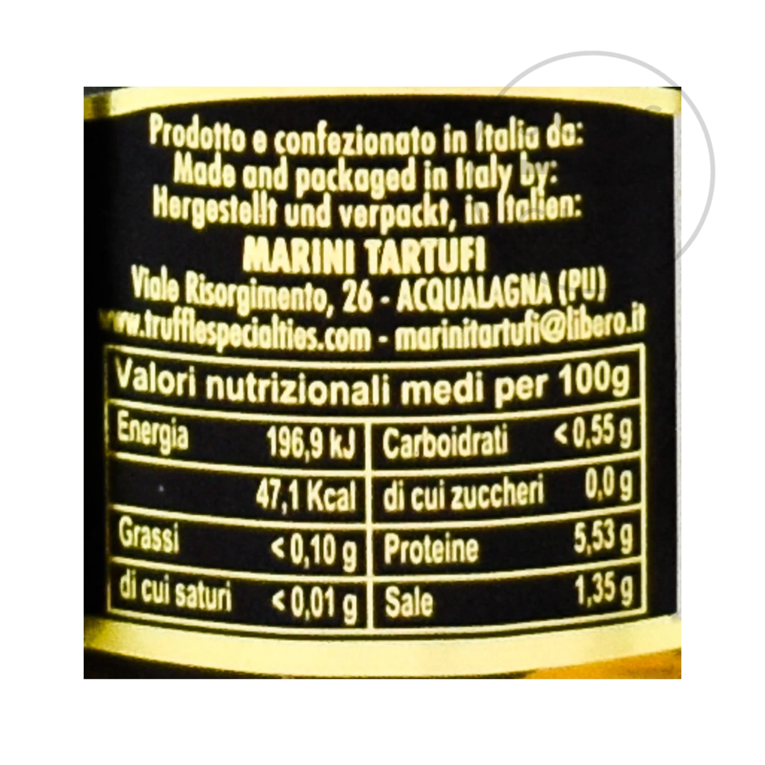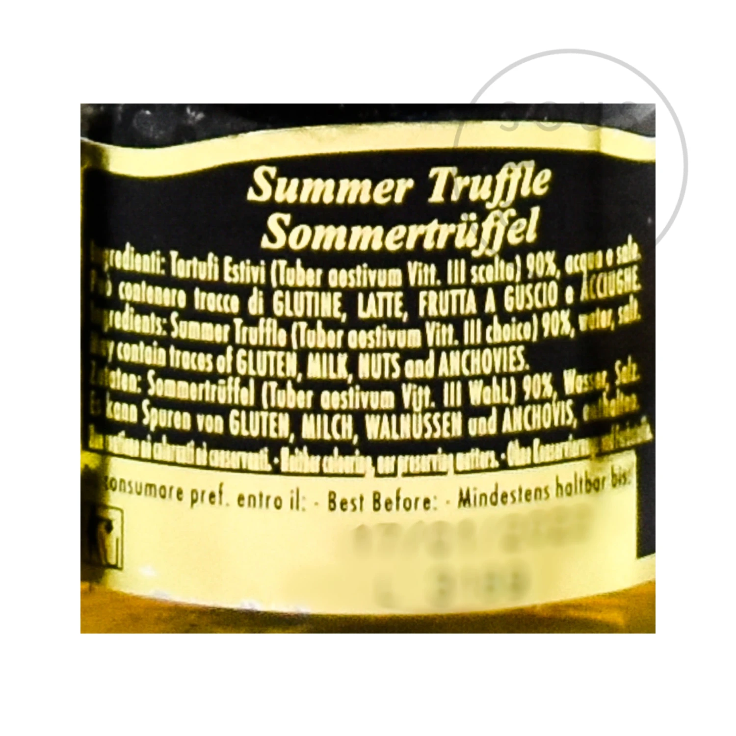 Ingredients: Summer truffle (tuber aestivum vitt), water, salt. May contain traces of gluten, milk, celery, anchovies, nuts.