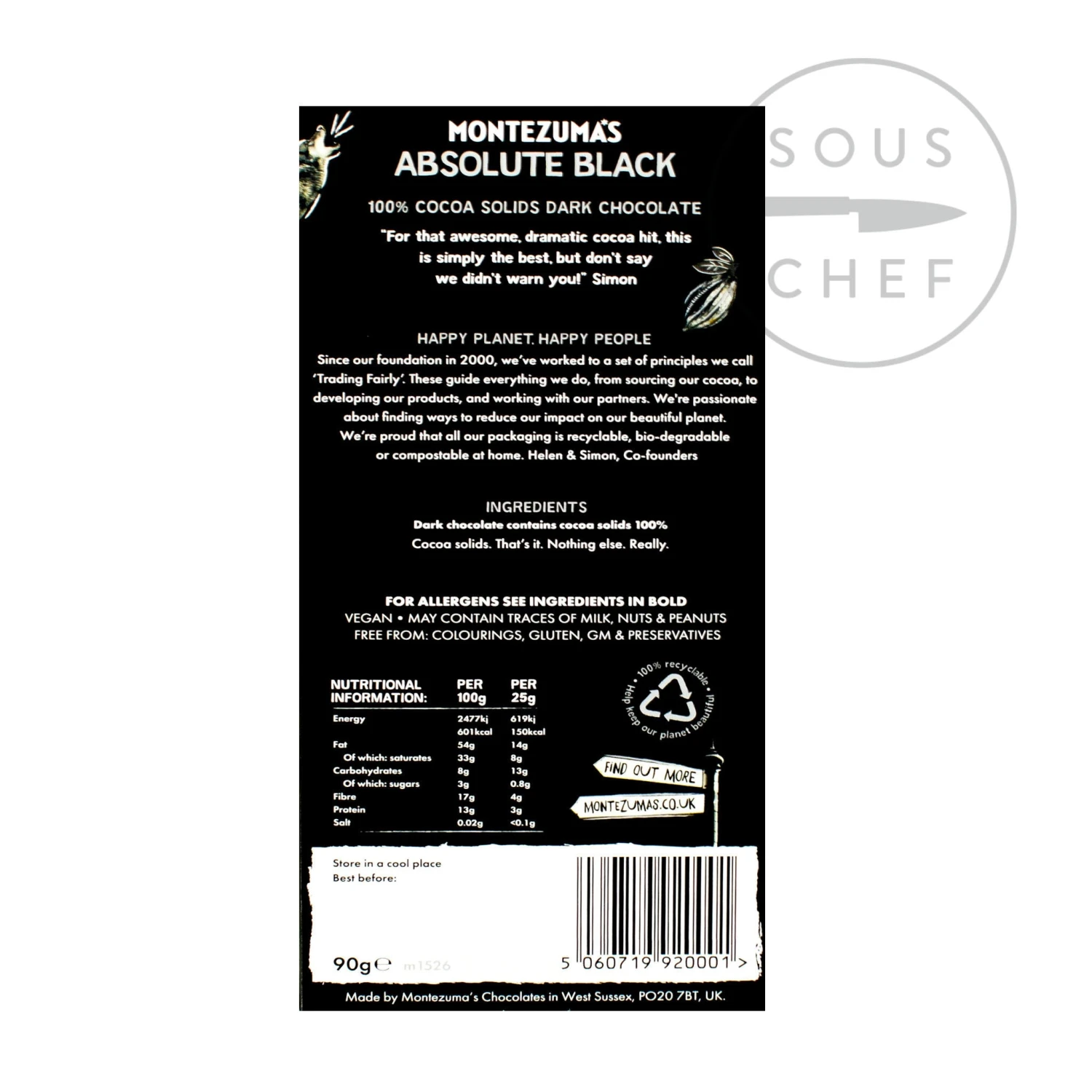 Montezuma’s Absolute Black 100% Cocoa chocolate bar is made from 100% cocoa has no added sugar, gluten, soya or milk – which makes it great for vegans.