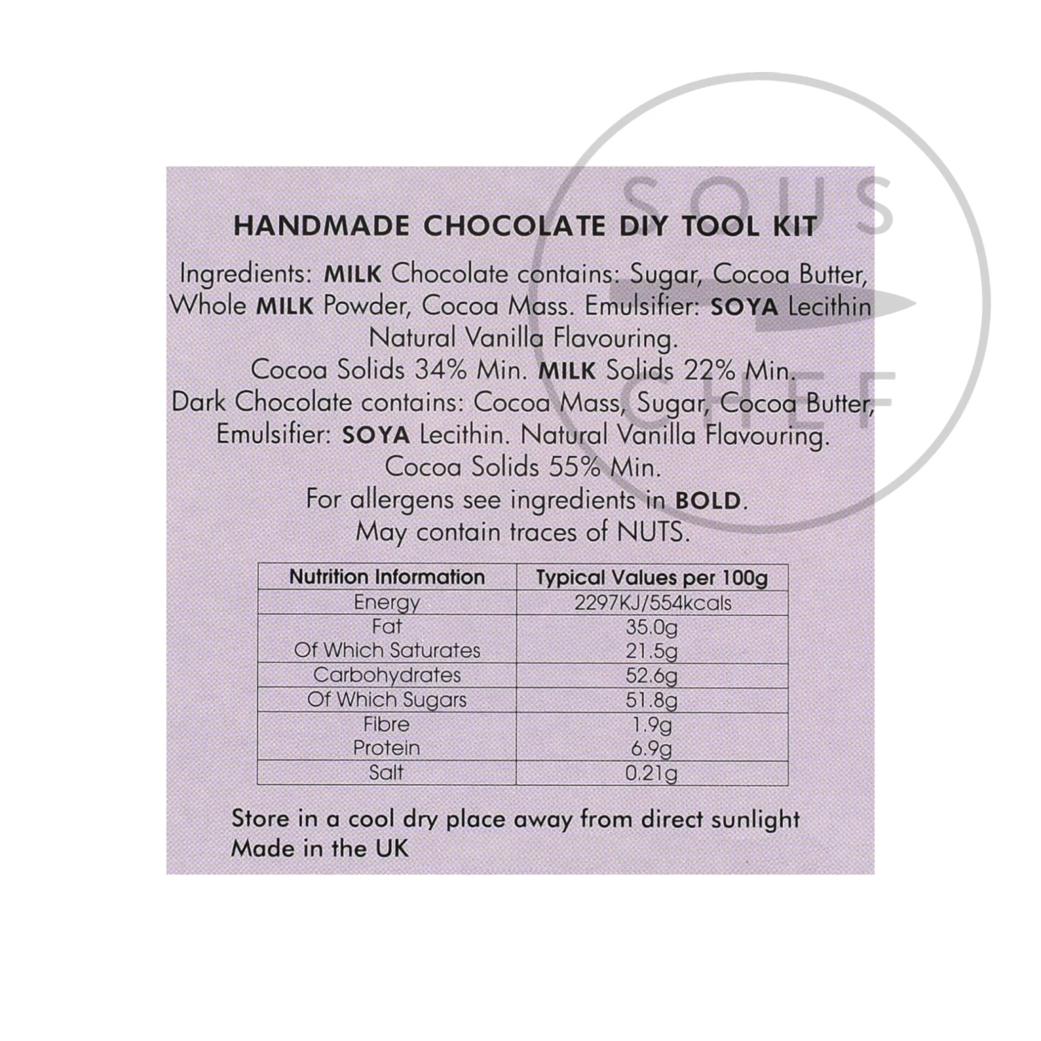 Ingredients: Milk Chocolate contains: Sugar, Cocoa Butter, Whole Milk Powder, Cocoa Mass, Emulsifier: Soya Lecithin. Natural Vanilla Flavouring. Cocoa Solids 34% Min, Milk Solids 22% Min. Dark Chocolate contains: Cocoa Mass, Sugar, Cocoa Butter, Emulsifier: Soya Lecithin. Natural Vanilla Flavouring. Cocoa Solids 55% Min.