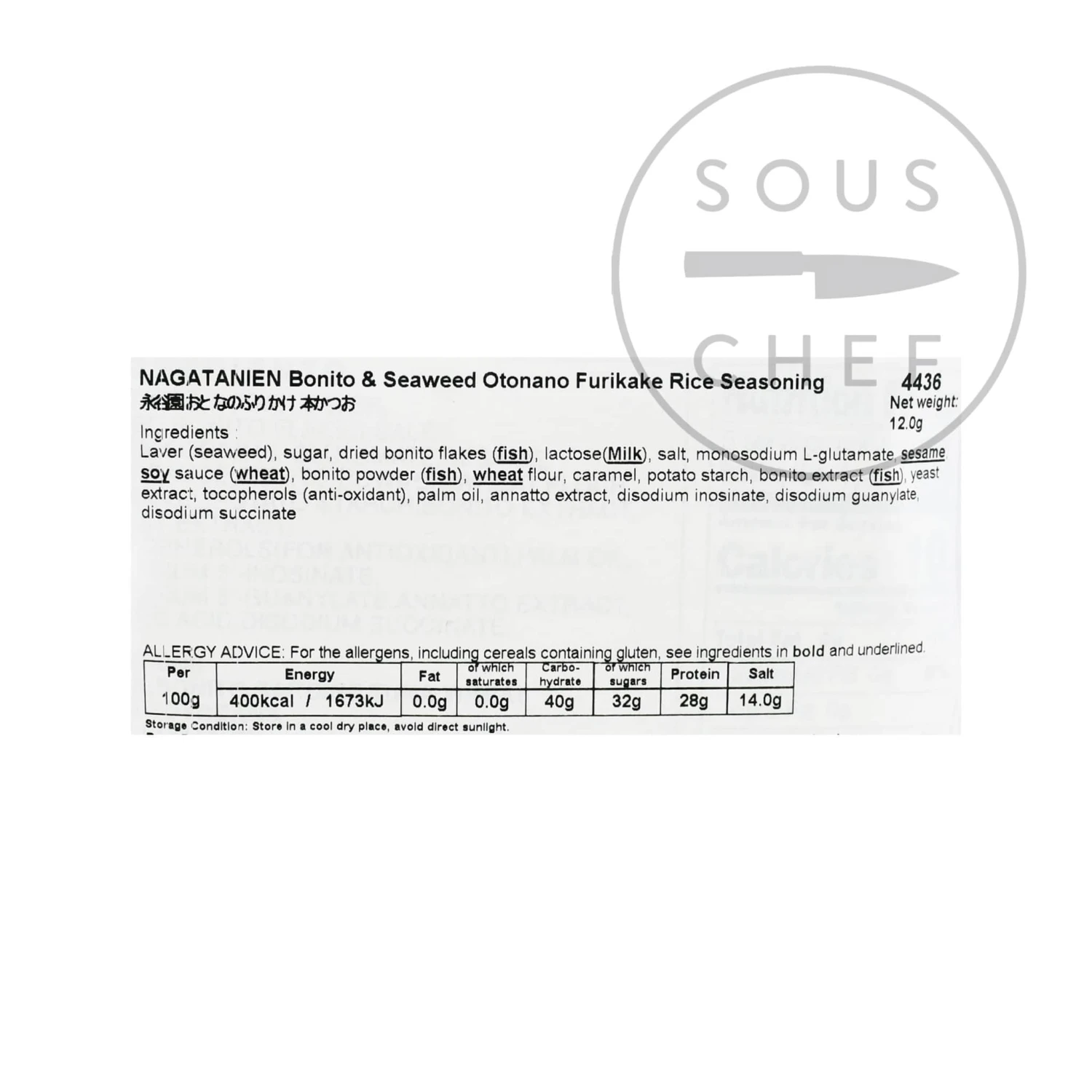 Ingredients: Laver (seaweed), sugar, dried bonito flakes (fish), lactose (milk), salt, monosodium L-glutamate, sesame, soy sauce (wheat), bonito powder (fish), wheat flour, caramel, potato starch, bonito extract (fish), yeast extract, tocopherols (anti-oxidant), palm oil, annatto extract, disodium inosinate, disodium guanylate, disodium succinate.Â