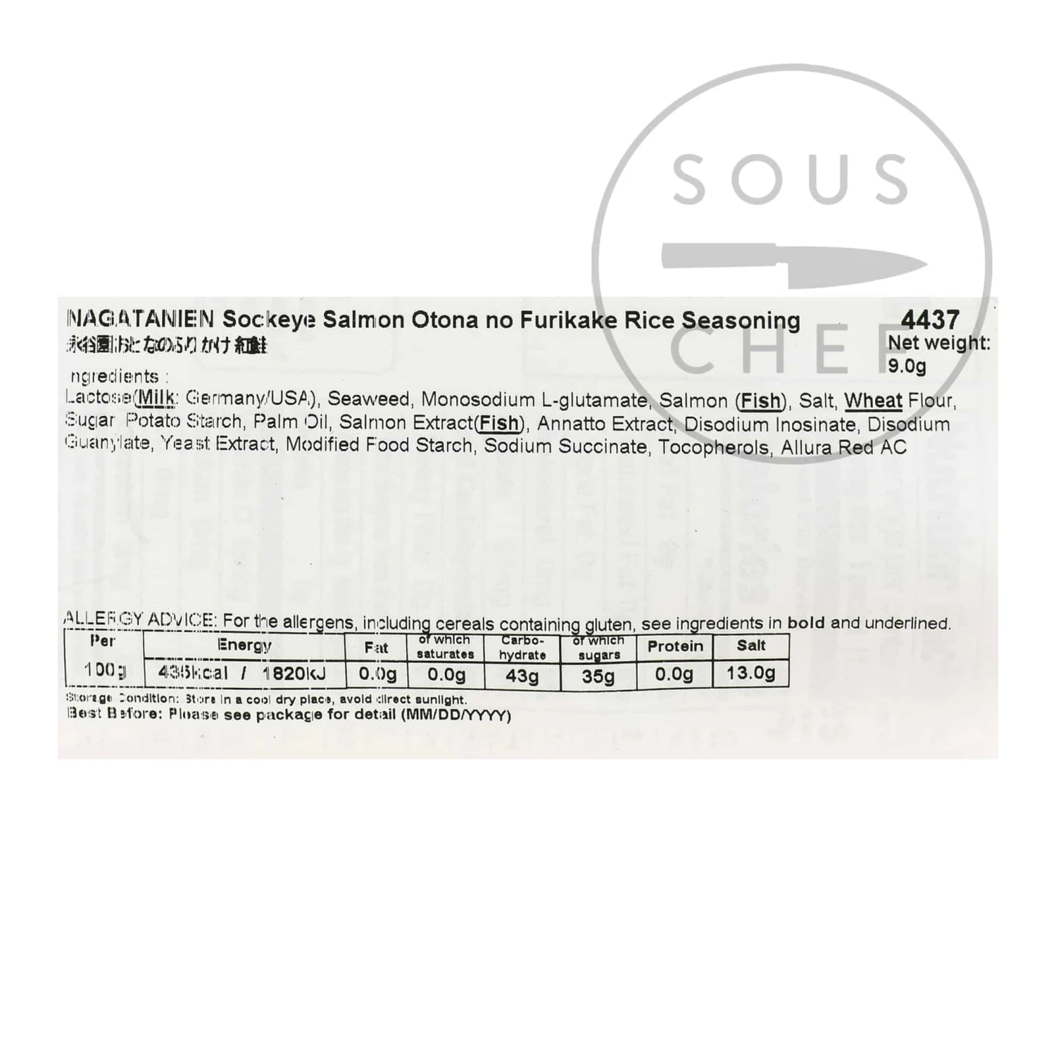 Ingredients: Lactose (milk: Germany/USA), seaweed, monosodium L-glutamate, salmon (fish), salt, wheat flour, sugar, potato starch, palm oil, salmon extract (fish), annatto extract, disodium inosinate, disodium guanylate, yeast extract, modified food starch, sodium succinate, tocopherols, allura red AC.