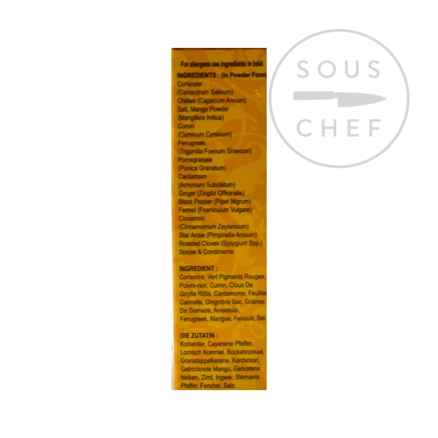 Ingredients: Pomegranate, cardamon, cinnamon, star anise, roasted cloves, coriander, dry green chillies, cumin, mango powder, black pepper, fenugreek, ginger, fennel, salt.Â