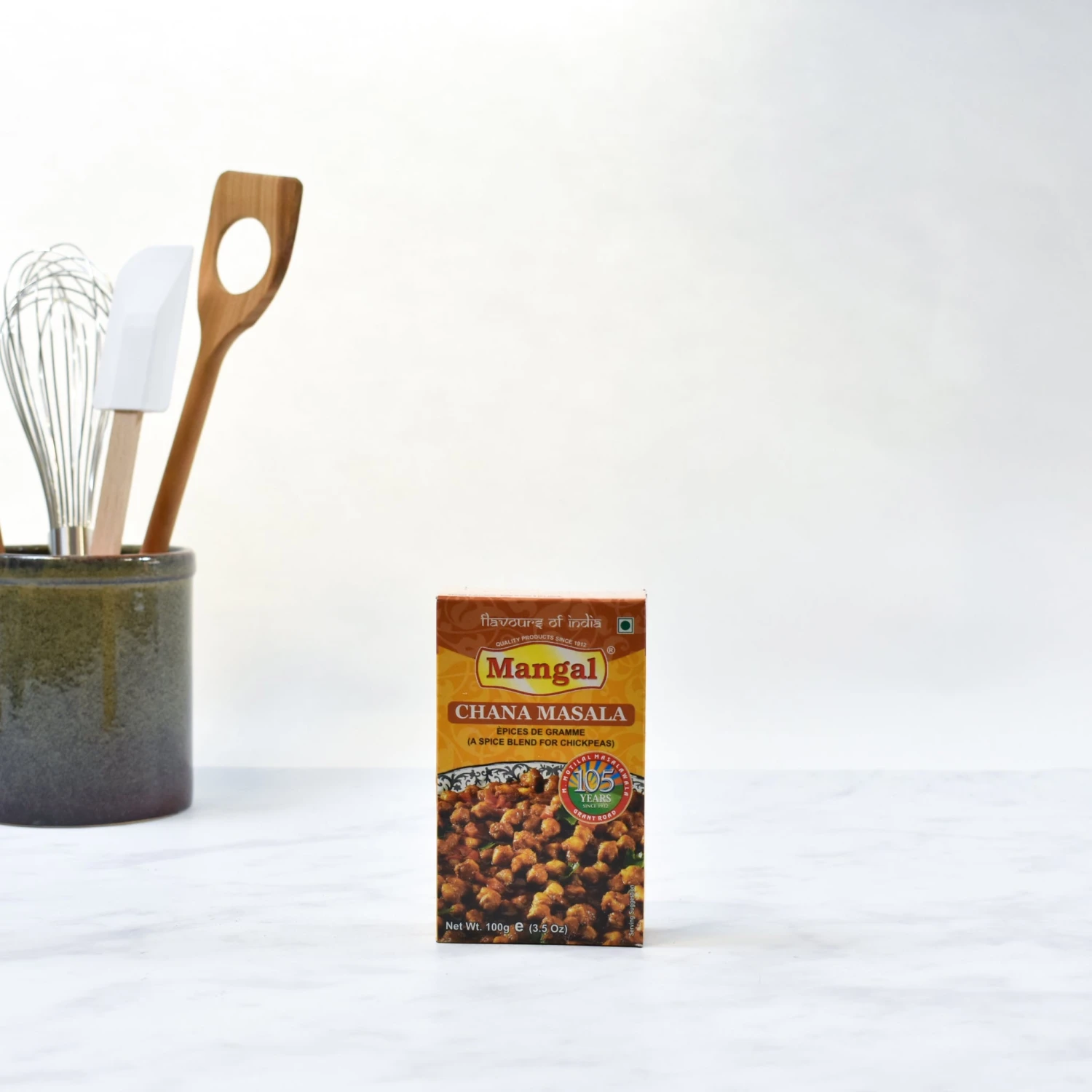 Chana masala is a convenient, ready-to-use mixture of spices, including aromatic star anise and cardamom, tangy mango powder and numerous others, designed specifically for use with chick peas or yellow pea dal, to which it adds a tasty, spicy kick.