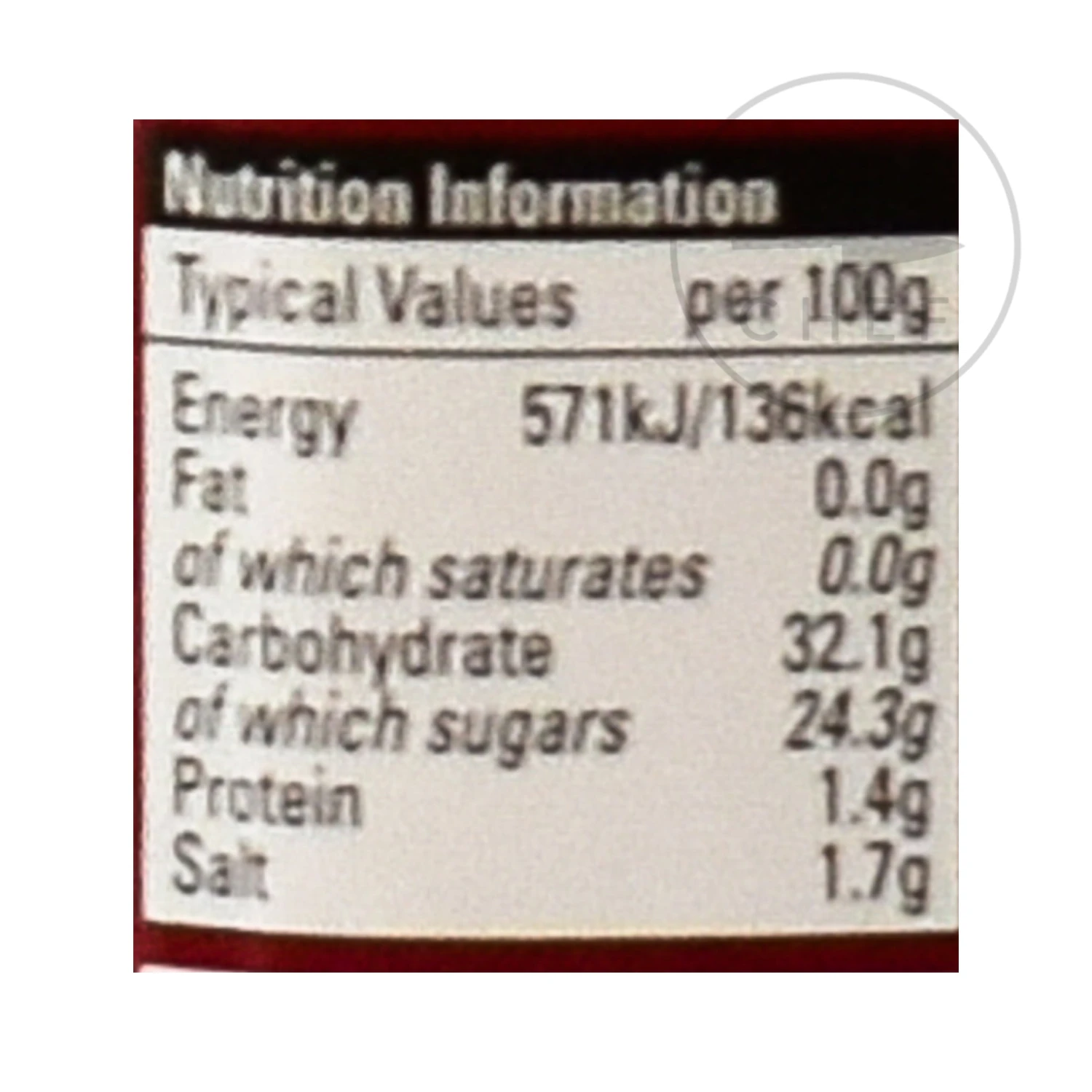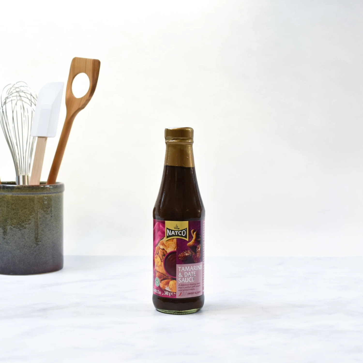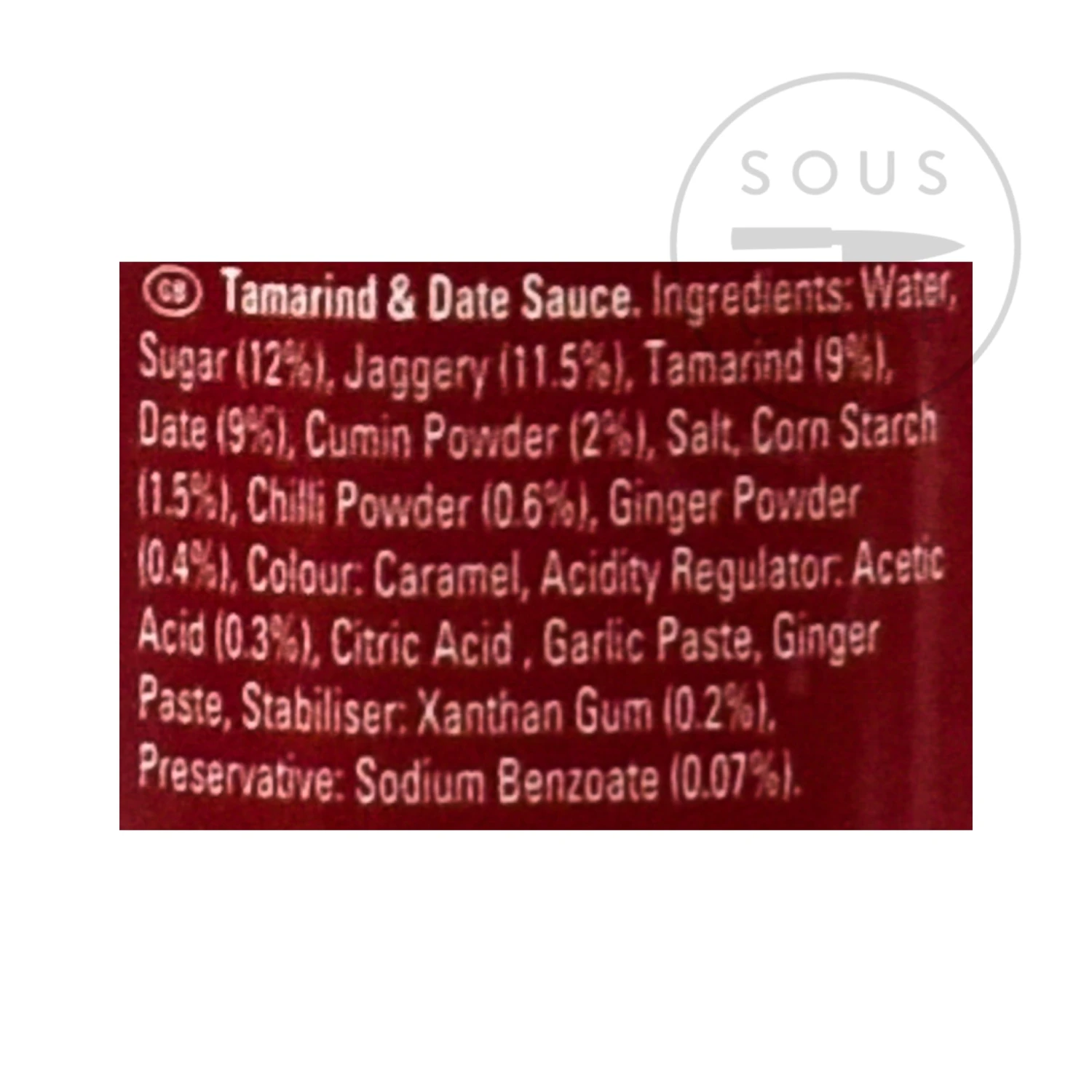 Ingredients: Water, tamarind (18%), date (9%), molases, salt, sugar, chilli, ginger, maize starch, mixed spice blend (contains colour: caramel), acidity regulator: citric acid, vinegar, preservative: soodium benzoate.