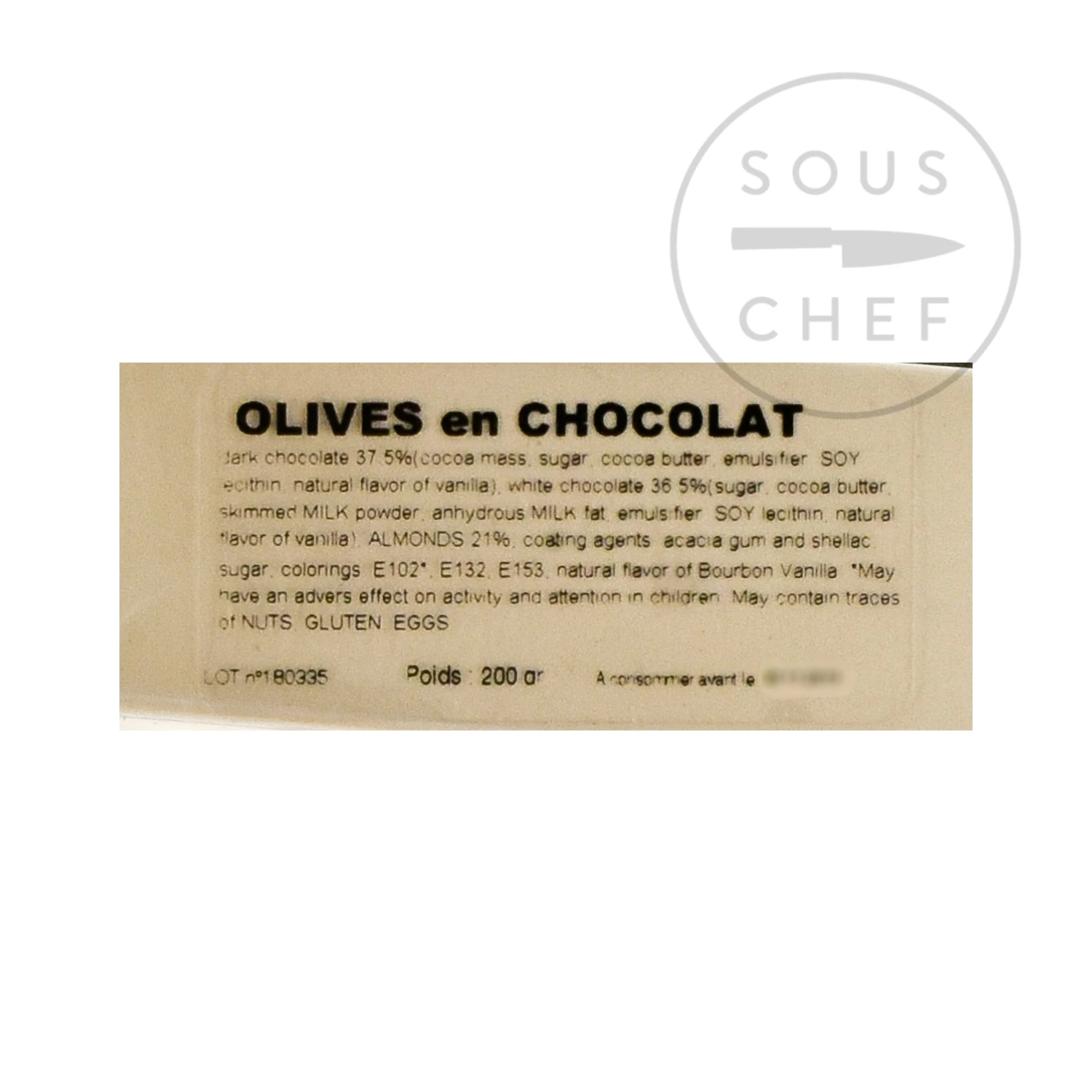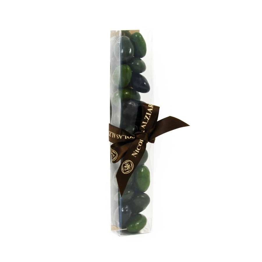 Provence olive-shaped chocolates are a quirky take on plain chocolate-coated almonds. The chocolate coating is cleverly painted to resemble black and green olives!