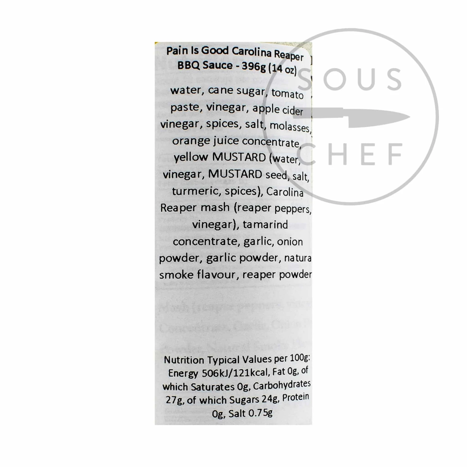 Ingredients: water, cane sugar, tomato paste, vinegar, apple cider vinegar, spices, salt, molasses, orange juice concentrated, yellow mustard (water, vinegar, mustard seed, salt, turmeric, spices), Caroline Reaper mash (reaper peppers, vinegar) tamarind concentrate, garlic, onion powder, garlic powder, natural smoke flavour, reaper powder.