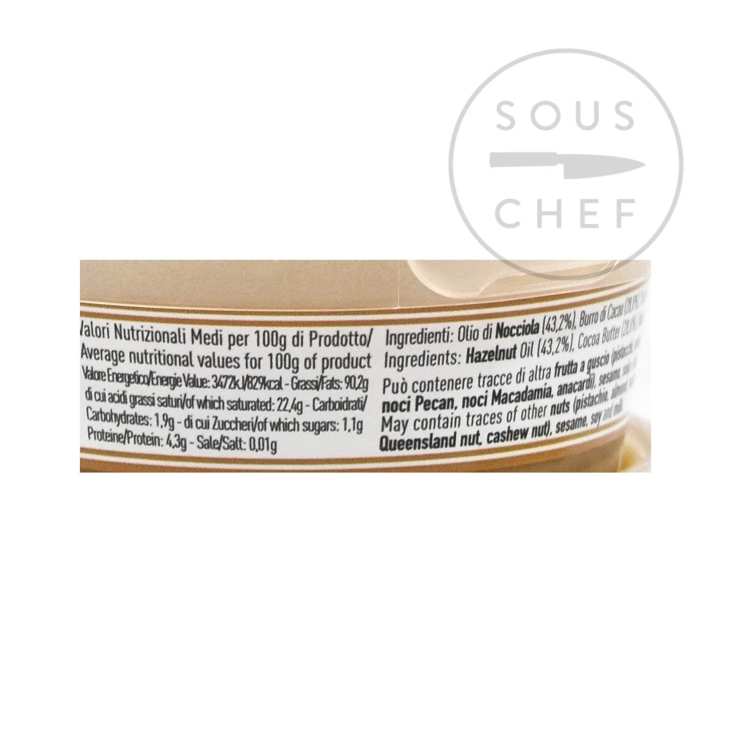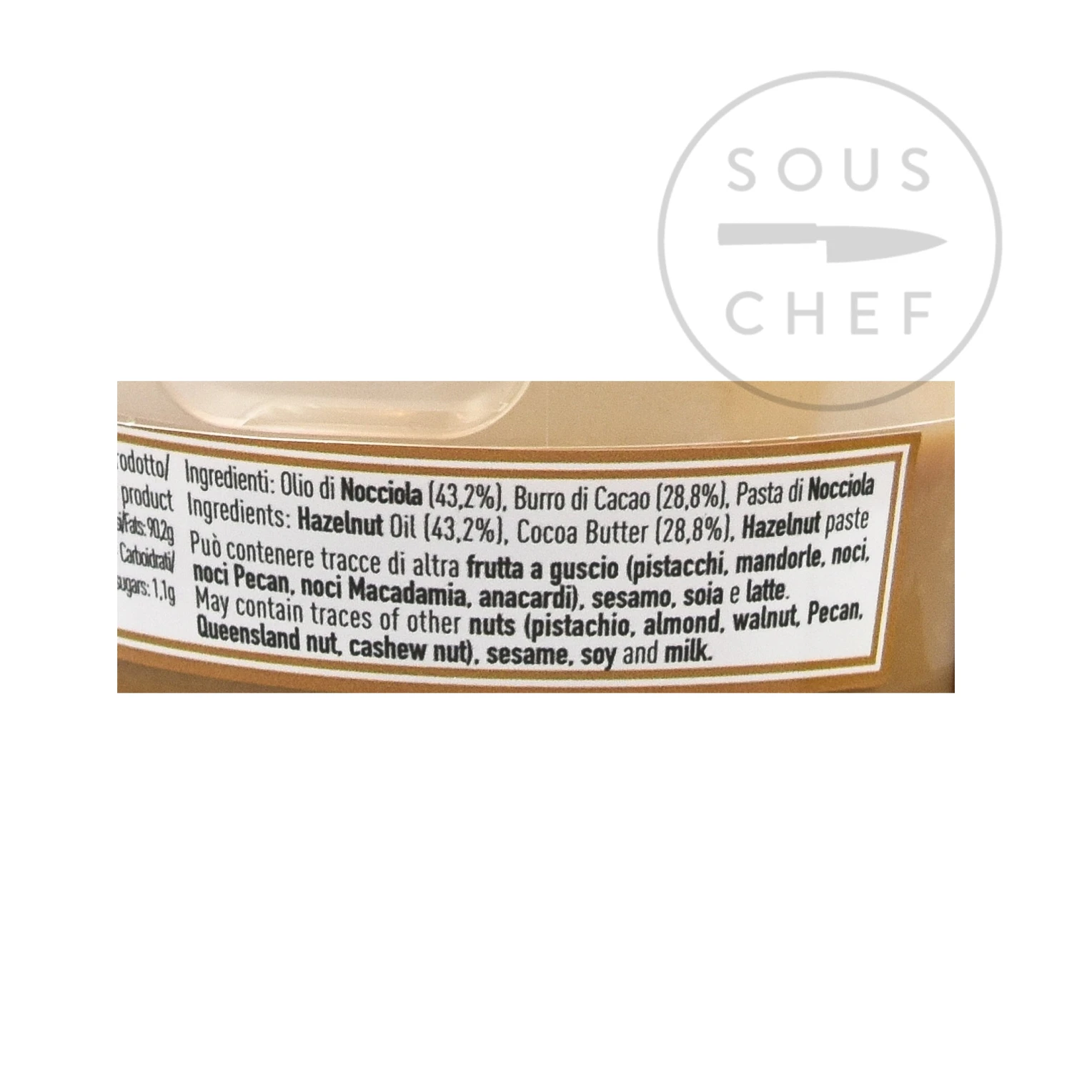 Ingredients: hazelnut oil (43.2%), cocoa butter (28.8%), hazelnut paste. Contains allergens: nuts. May contain traces of sesame, soy, and milk.