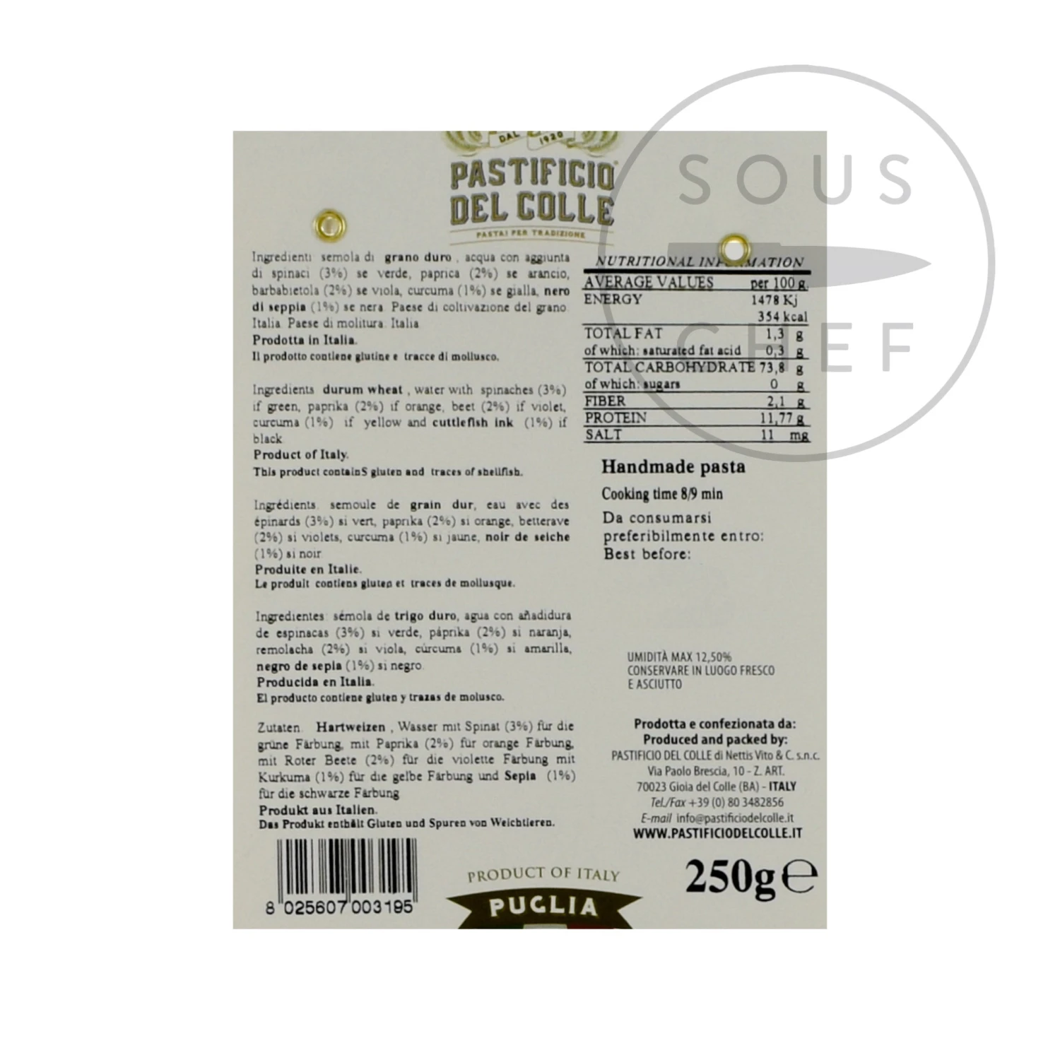Ingredients: Durum wheat semolina, water, spinach (3%), paprika (2%), beetroot (2%), turmeric (1%), cuttlefish ink (1%)