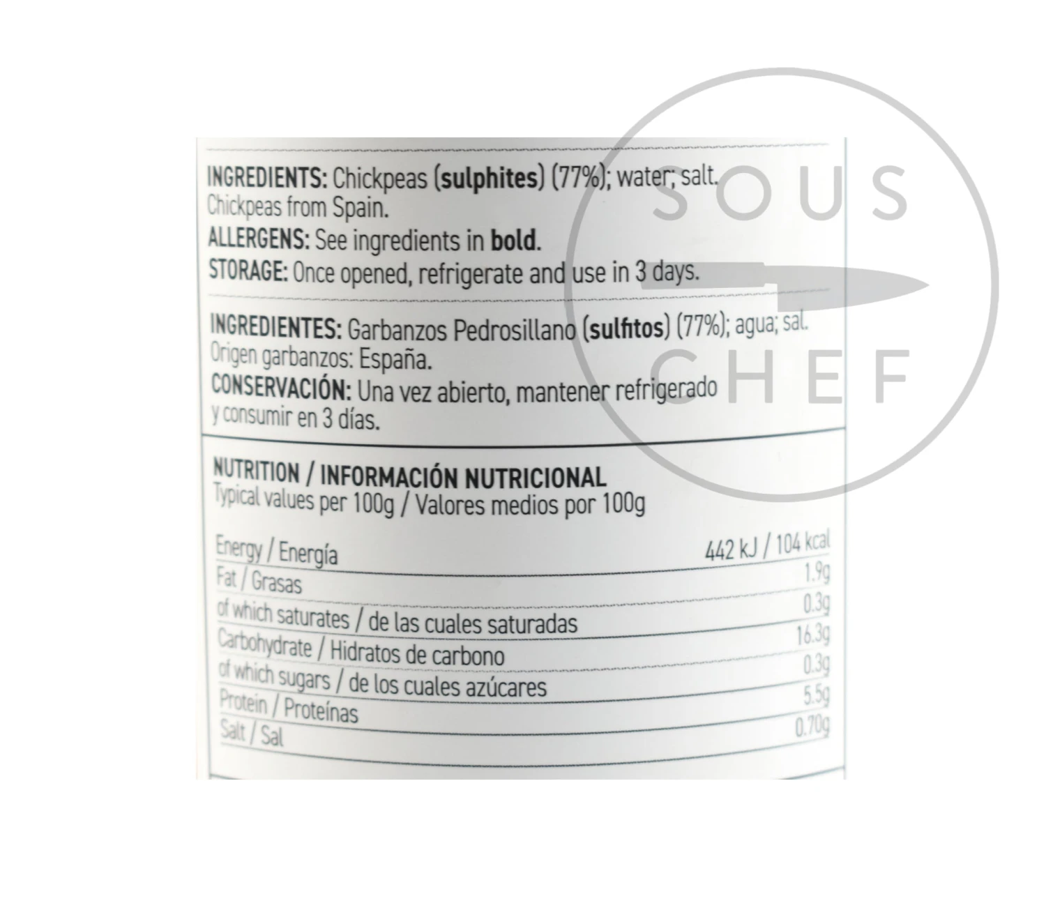Ingredients: Chickpeas (sulphites) (77%), water, salt.Â