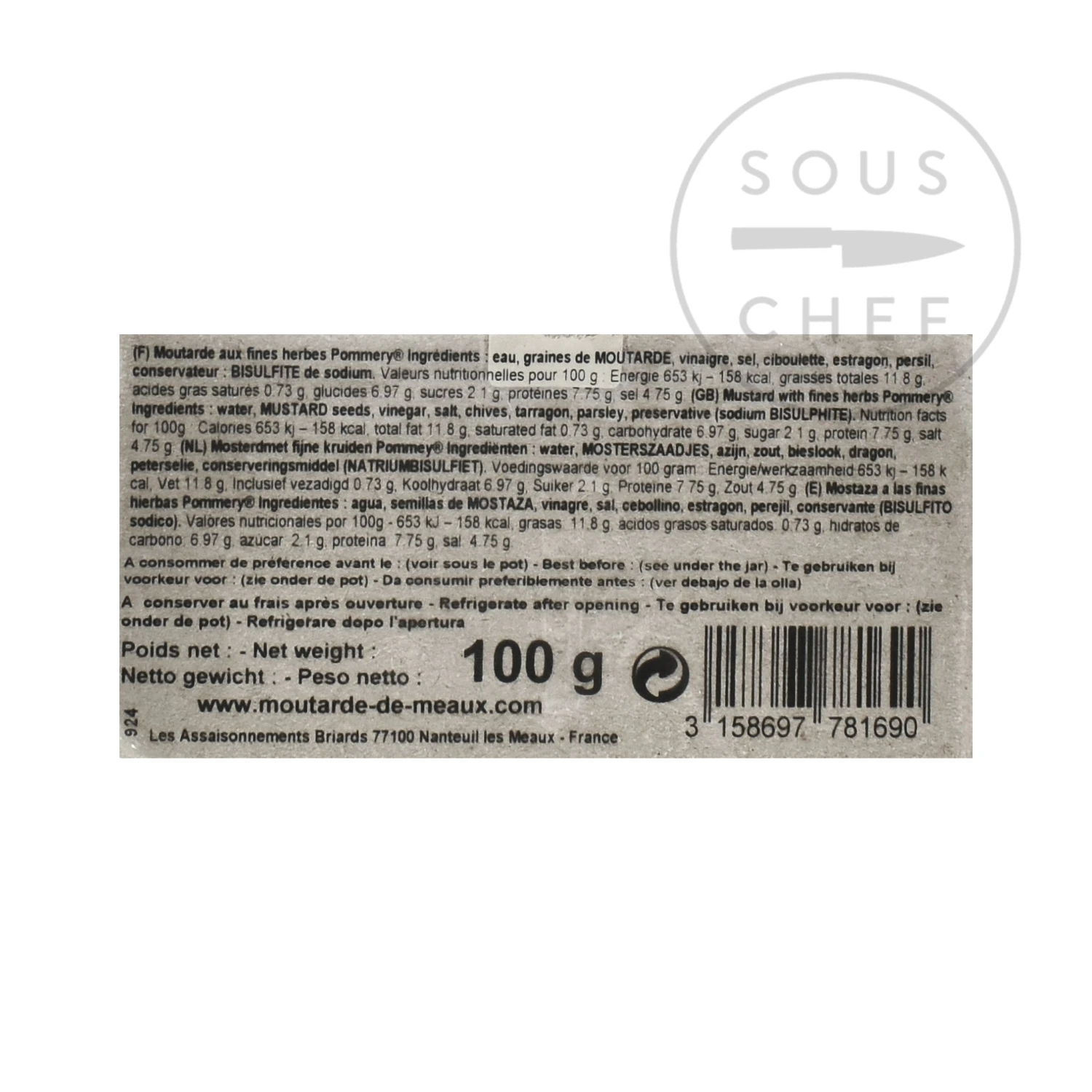 Ingredients: water, mustard seeds, vinegar, salt, chives, tarragon, parsley, preservative (sodium bisulphate). Contains allergens: mustard.
