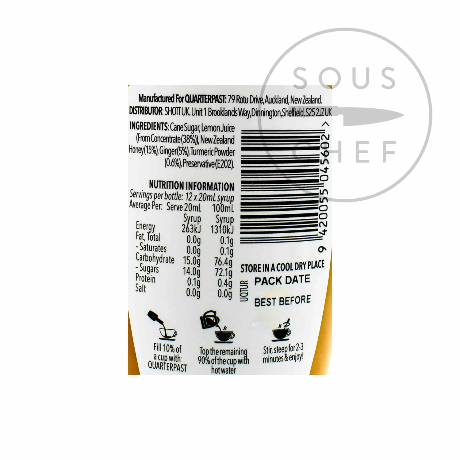 Ingredients: Cane sugar, lemon juice (from concentrate 38%), New Zealand honey (15%), ginger (5%), turmeric powder (0.6%), preservative (E202).