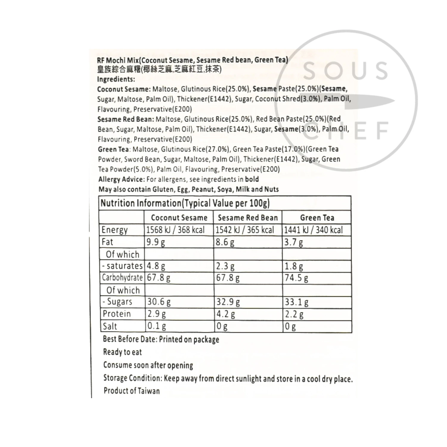 Ingredients: maltose, glutinous rice (25%), sugar, thickening agent (E1442), sesame paste (5.5%) (sesame, sugar, maltose, palm oil), red bean paste (5.5%) (red bean, sugar, maltose, palm oil), green tea paste (5.5%) (green tea powder, sword bean, sugar, maltose, palm oil), coconut (3.25%), sesame (3.25%), palm oil, green tea powder (2.5%), flavouring, preservative (E200). Allergens are listed in bold.