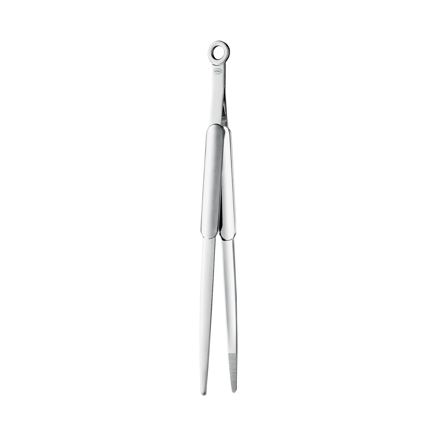 Rosle’s Modern Classics fine tongs are a useful kitchen utensil when preparing and cooking shellfish such as scallops, and other delicate ingredients. Made of stainless steel, the long tongs have slightly curved tips to lift ingredients without damaging them.Â