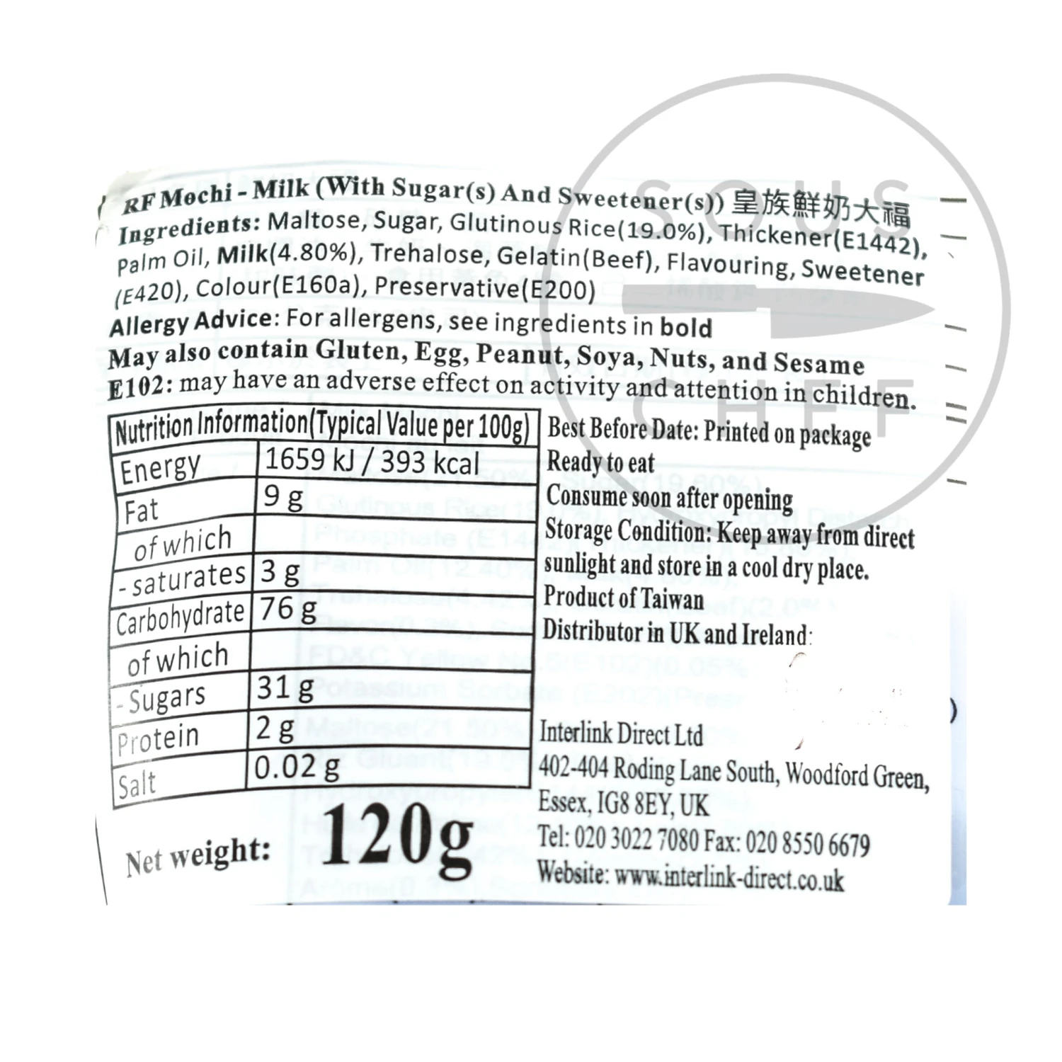 Ingredients: Maltose, sugar, glutinous rice (19%), thickener (E1442), palm oil, milk (4.8%), trehalose, gelatin (beef), flavouring, sweetener (E420), colour (E160a), preservative (E200)