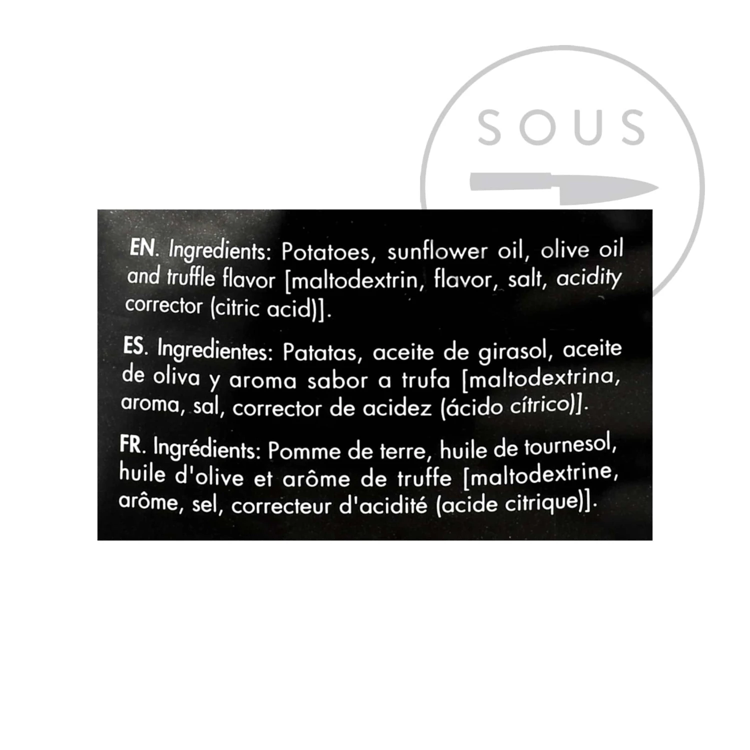 Ingredients: Potatoes, sunflower oil, olive oil and truffle flavour (maltodextrin, flavour, salt, acidity corrector (citric acid)).