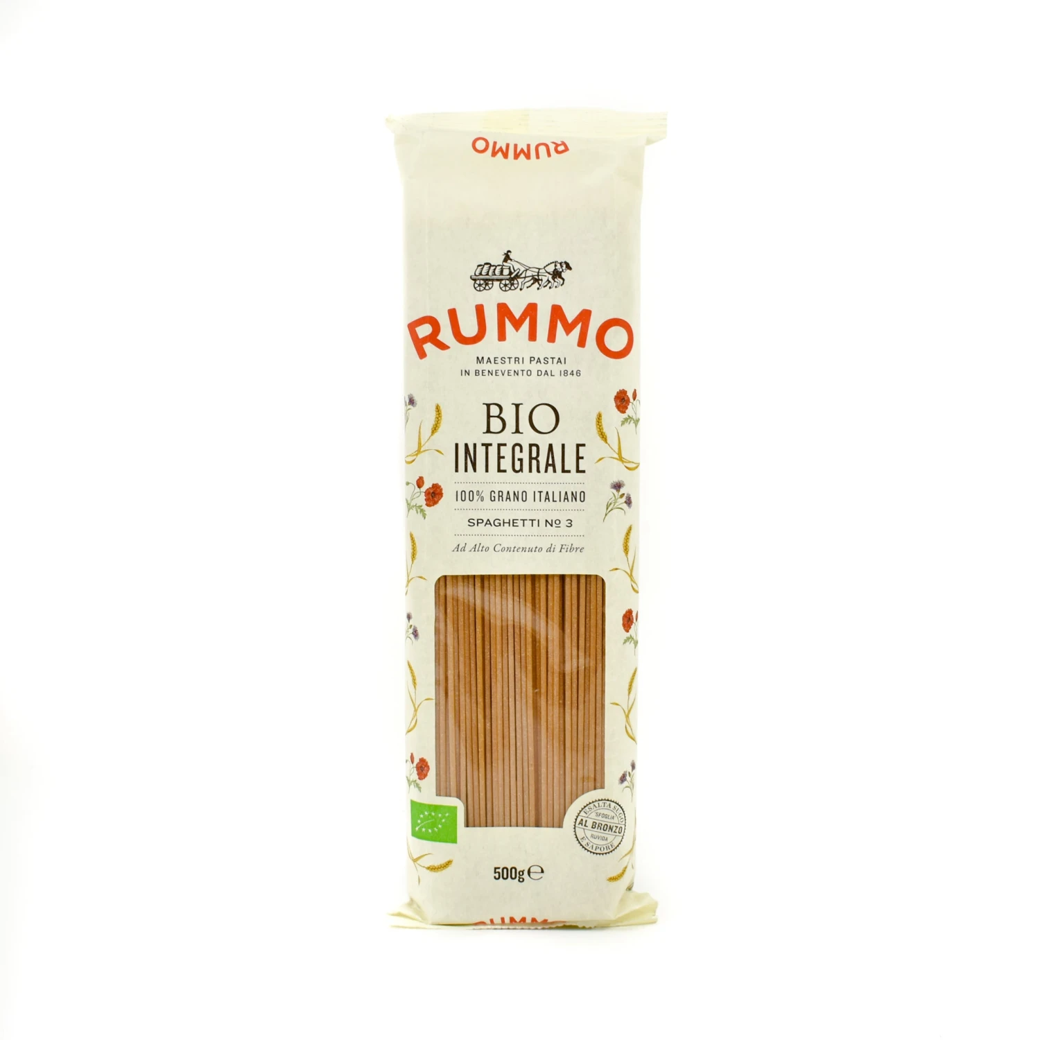 Rummo wholemeal organic spaghetti no. 3 is the new wholemeal version of this favourite pasta shape. The pasta is made with organic wholemeal durum semolina and extruded through bronze dies. The rough surface allows sauce to cling to the pasta. Rummo wholemeal organic spaghetti cooks in 9 minutes.
