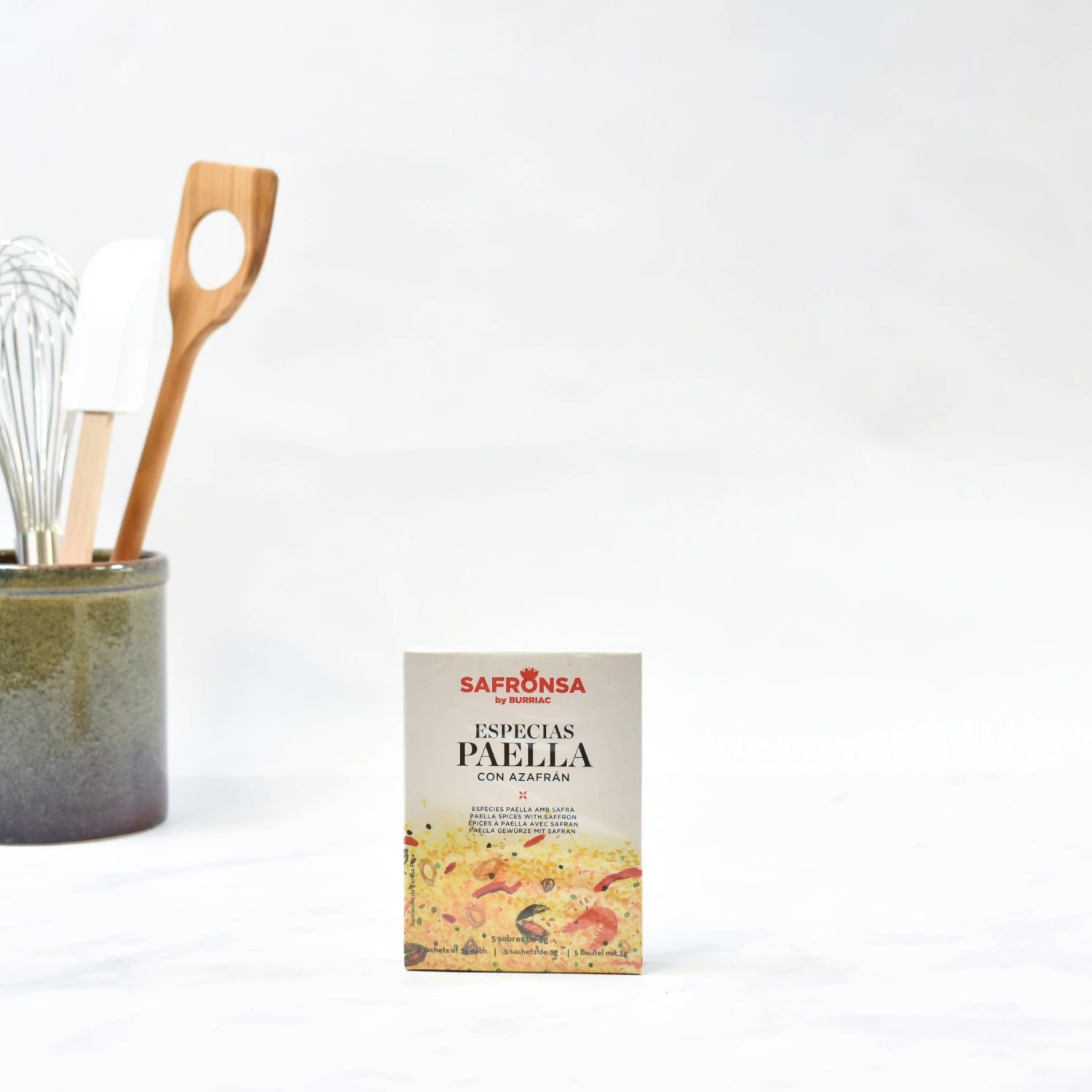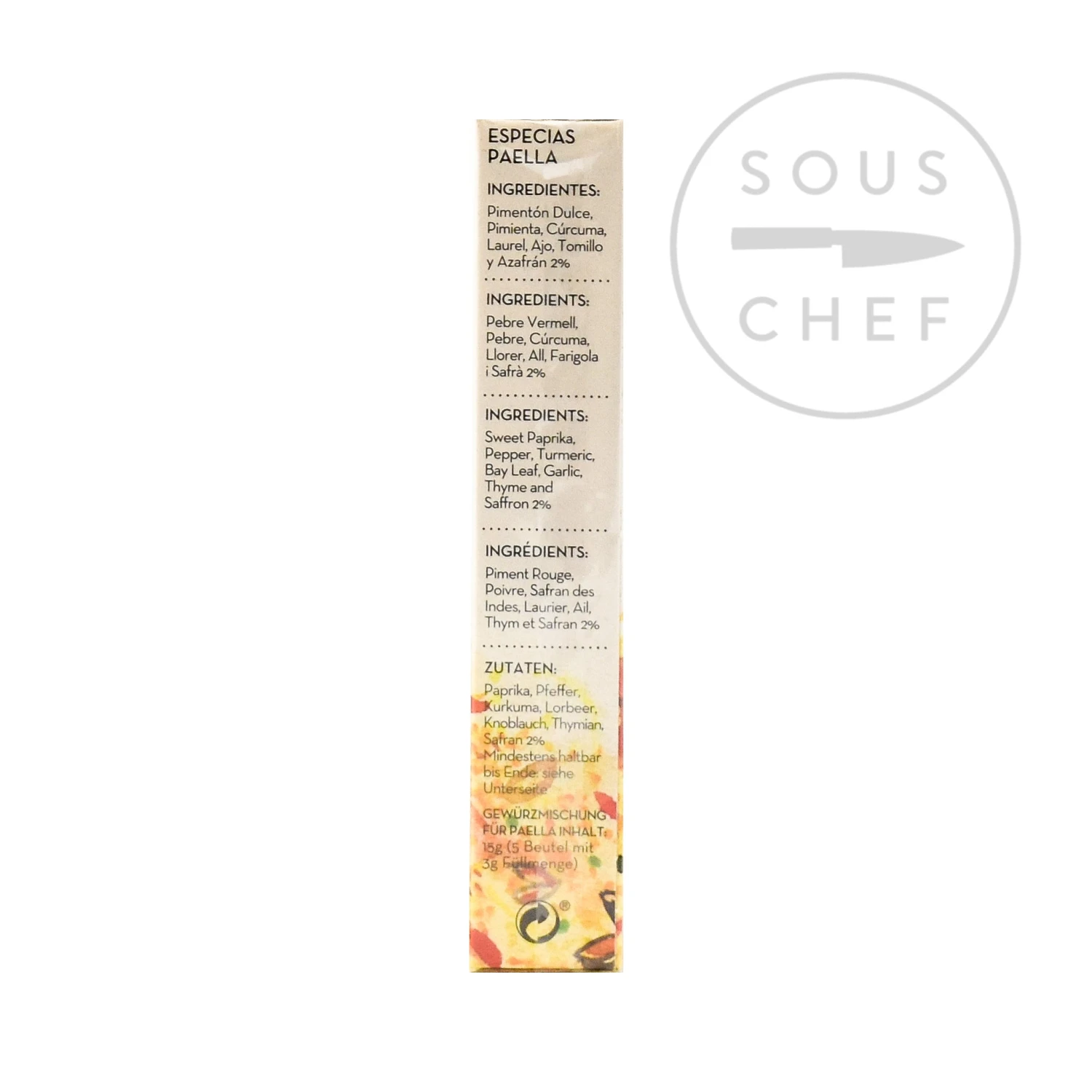 Use paella seasoning sachets to make an authentic looking and tasting paella quickly and easily. Simply sprinkle the contents of one sachet into cooked, short-grain rice and stir through. The paella seasoning includes five sachets of saffron and turmeric to give your paella the classic golden colour, and sweet paprika, pepper, bay leaf, garlic and thyme for great flavour. Just add the toppings of your choice – seafood, chicken, vegetables – and your paella is ready to serve.