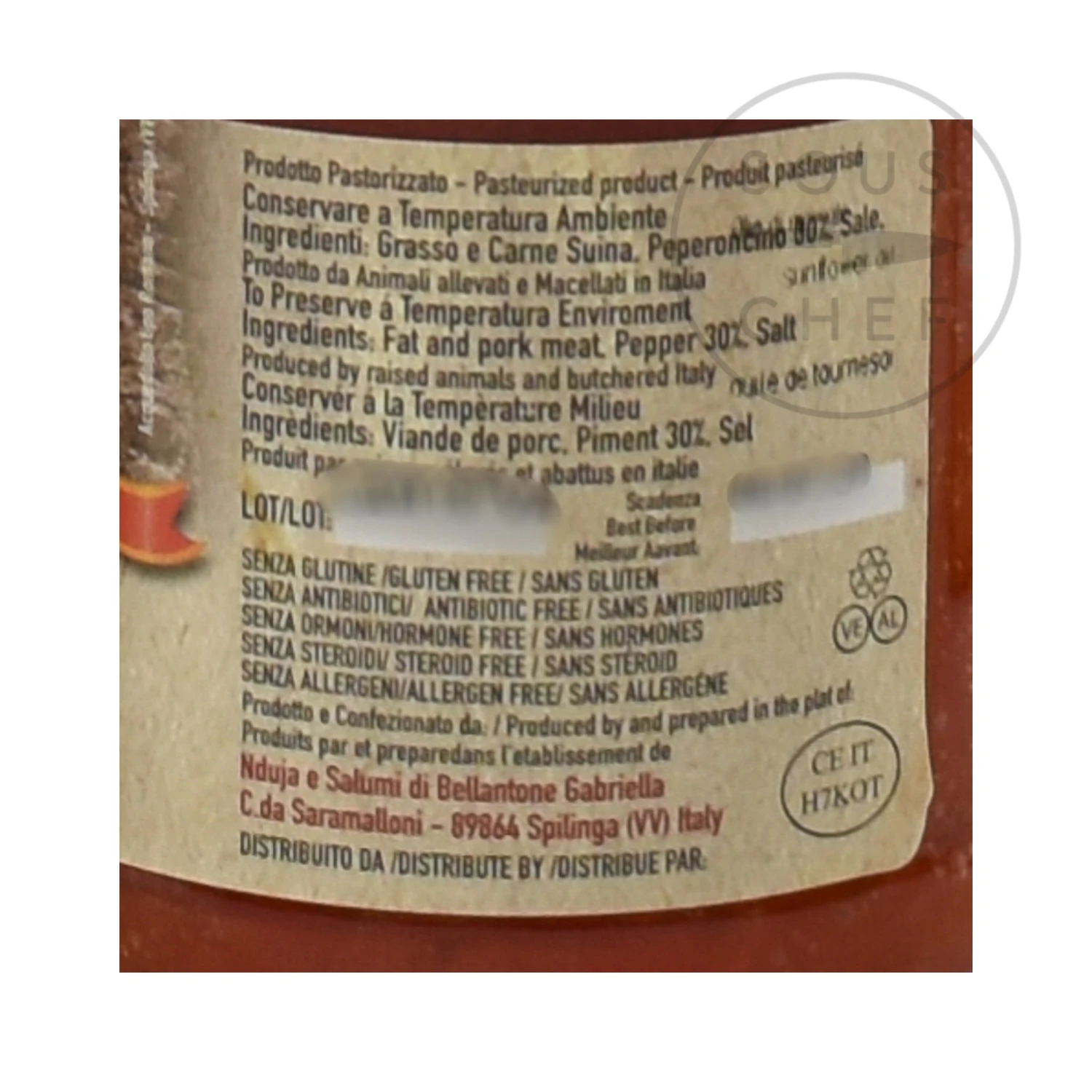 Ingredients: Fat and pork meat, peppers (30%), salt (no preservatives, artificial colours or flavours).