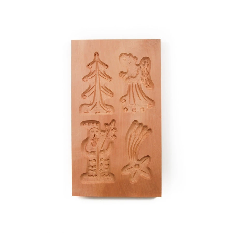 Use this pear wood springerle & speculaas mould with Christmas figures designs to make traditional German and Dutch Belgian biscuits. The mould features a Christmas tree, angel, Santa Claus and a shooting star.