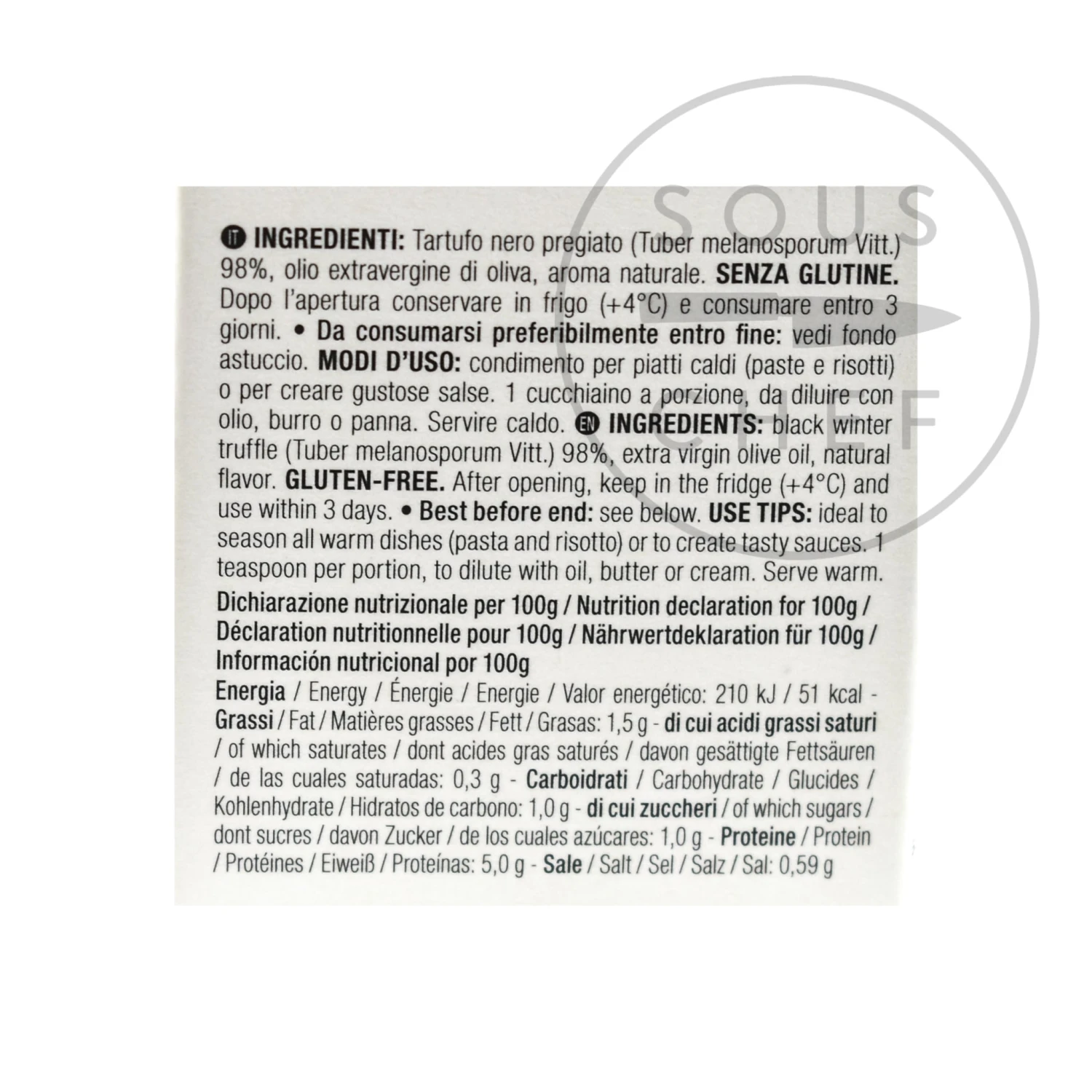 Ingredients: Black winter truffle (tuber melanosporum vitt.) 98%, extra virgin olive oil, natural flavour.