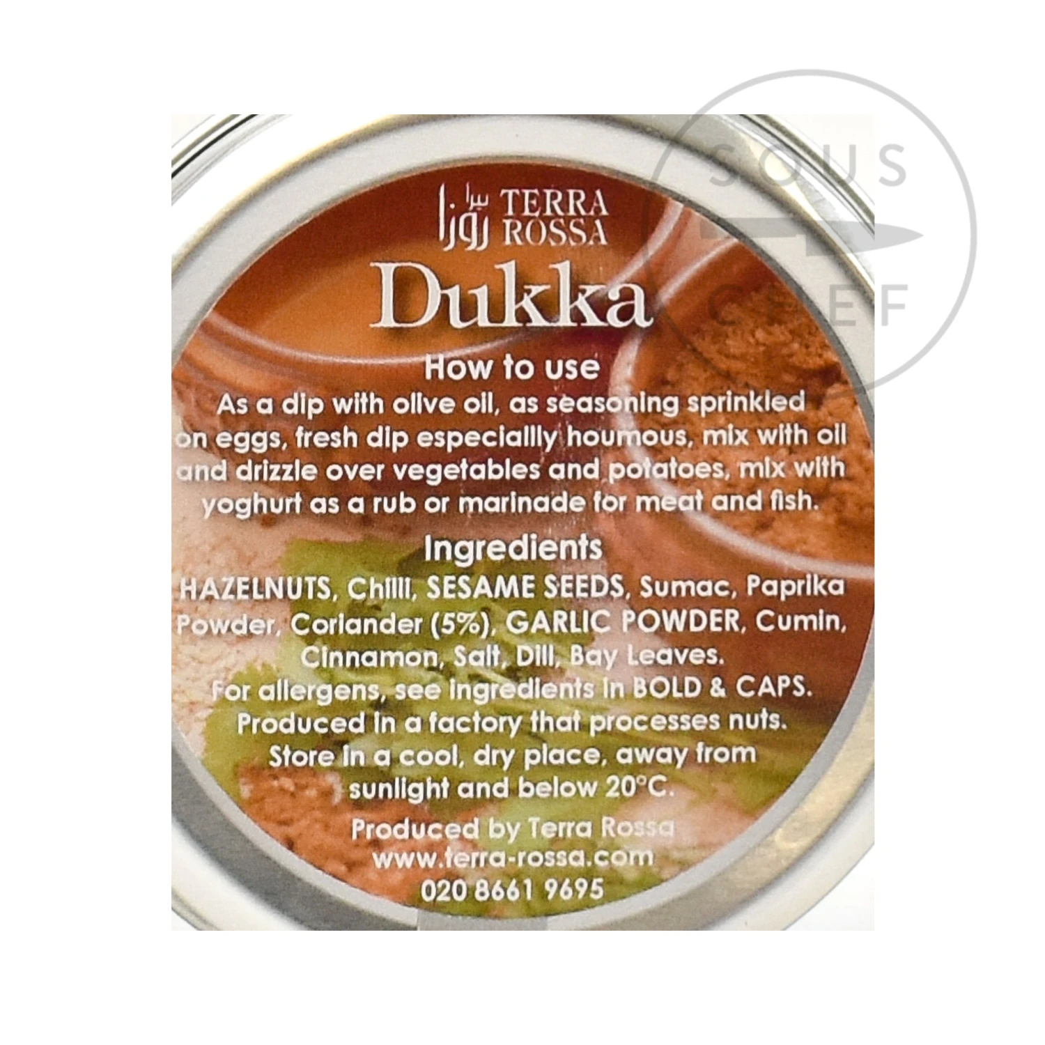 Terra Rossa’s Dukka is the classic North African blend of roasted sesame and aromatic spices. The dukka – or dukkah – is perfect for sprinkling over hummus, salads, yoghurt and vegetables. Mixed with olive oil it makes a tasty dip for pitta bread. Try using the dukka to season chicken, lamb, potatoes, curries and even stir-fries. Or be adventurous and make your own flatbread – finish with a generous scatter of the spicy dukka for an authentic Middle Eastern starter or snack.