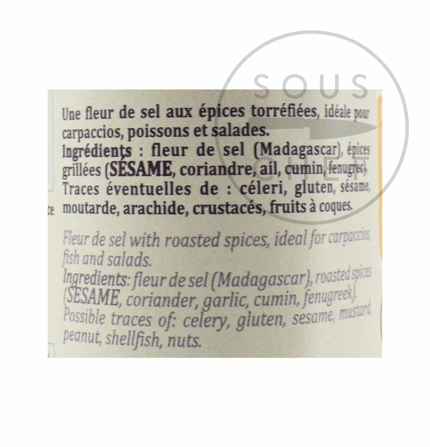 Ingredients: Fleur de sel (Madagascar), roasted spices (sesame, coriander, garlic ,cumin, fenugreek)