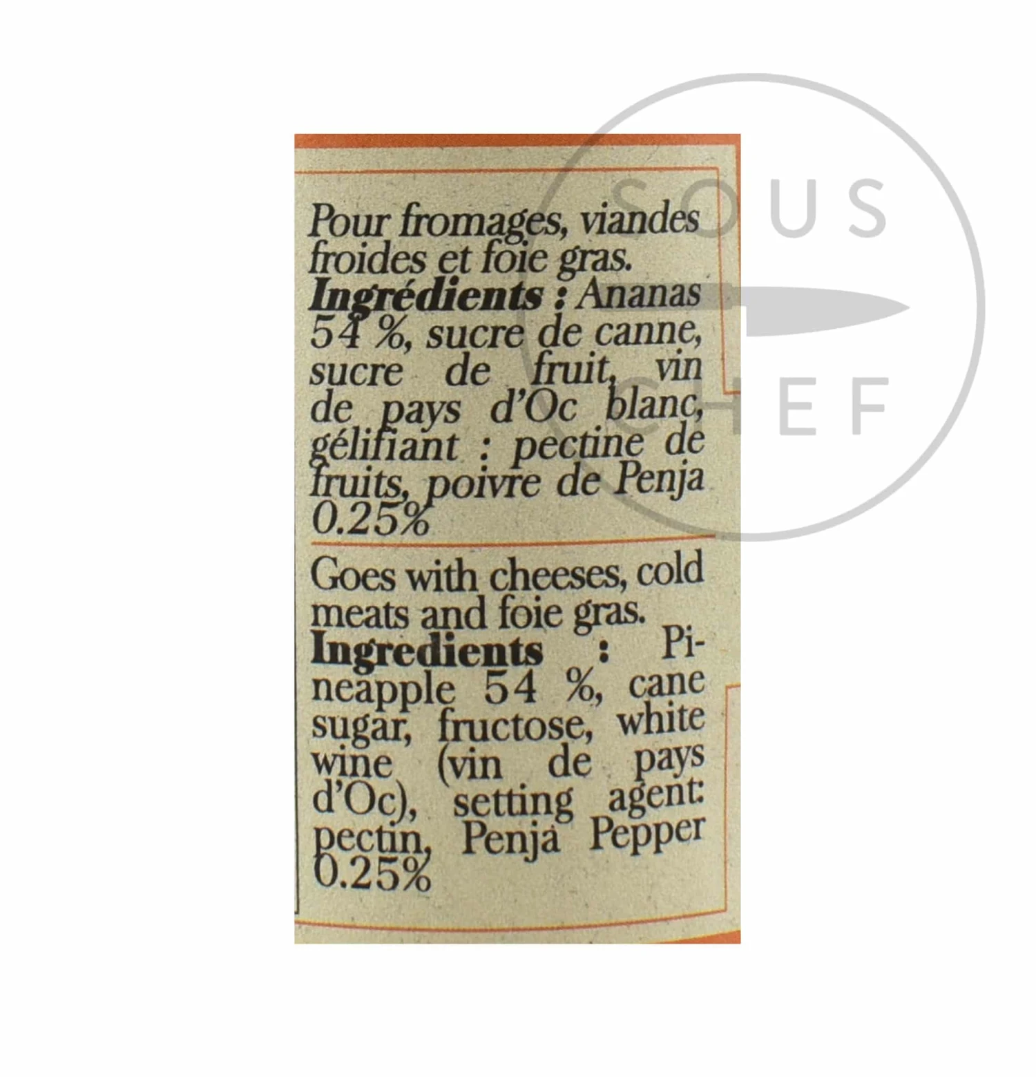Ingredients: Pineapple 54%, cane sugar, fruits sugar, white Oc wine, gelling: fruit pectin, Penja pepper 0.25%.