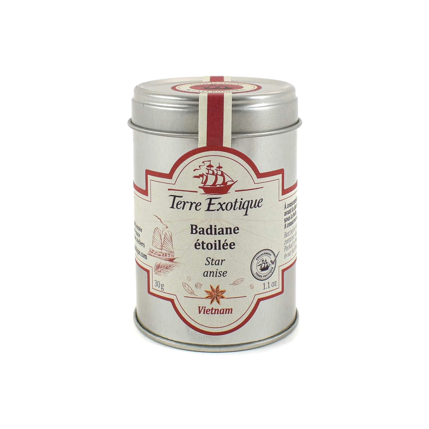 Terre Exotique’s star anise brings heady, aniseed flavours to stocks, marinades and mulled wine. Star anise comes from the eight-pointed pericarp of the fruit of the Illicium verum tree which grows in four provinces of China. It is harvested twice a year, then left to dry in the sun – all stages of production are done by hand.Â