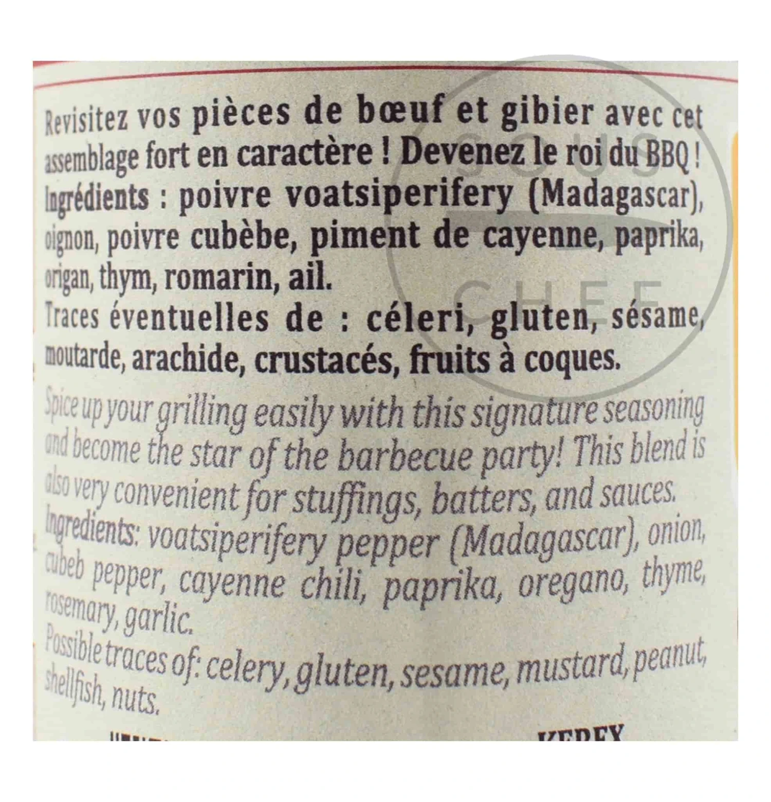 Ingredients: Onion, voatsiperifery pepper, cubeb pepper, paprika, cayenne chili pepper, red kampot pepper, garlic, rosemary, thyme and oregano