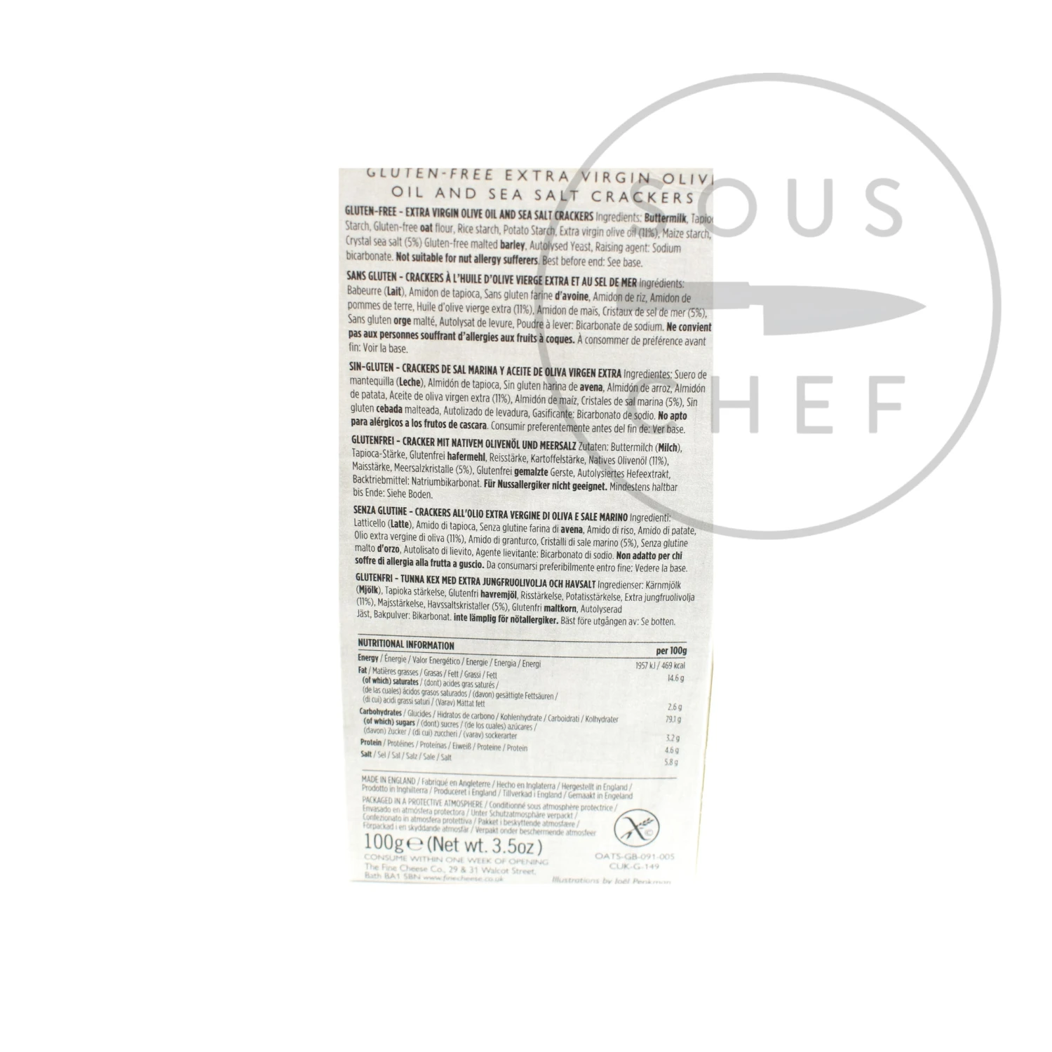 Gluten free extra virgin olive oil and sea salt crackers are a crunchy base for slices of hard cheese and a drizzle of honey. Made with a blend of gluten-free cereals, buttermilk and extra virgin olive oil, these crisp crackers have a subtle flavour of rich olive oil and are finished with flecks of sea salt.