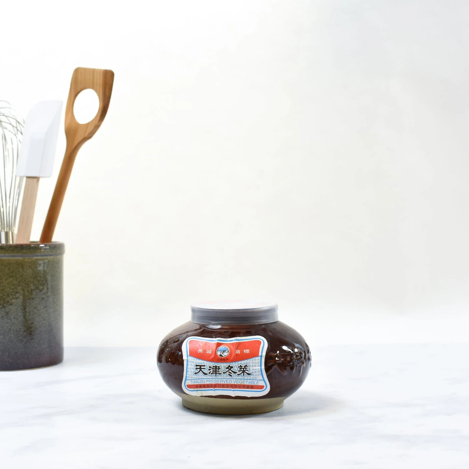 Tianjin preserved vegetable is a dry, salty condiment so works well in liquid dishes like a congee, mapo dofu or a pork-based broth. It is also great mixed into a with baozi stuffing, or used as a salty garnish for fried vegetables dishes. Rinse well before using.