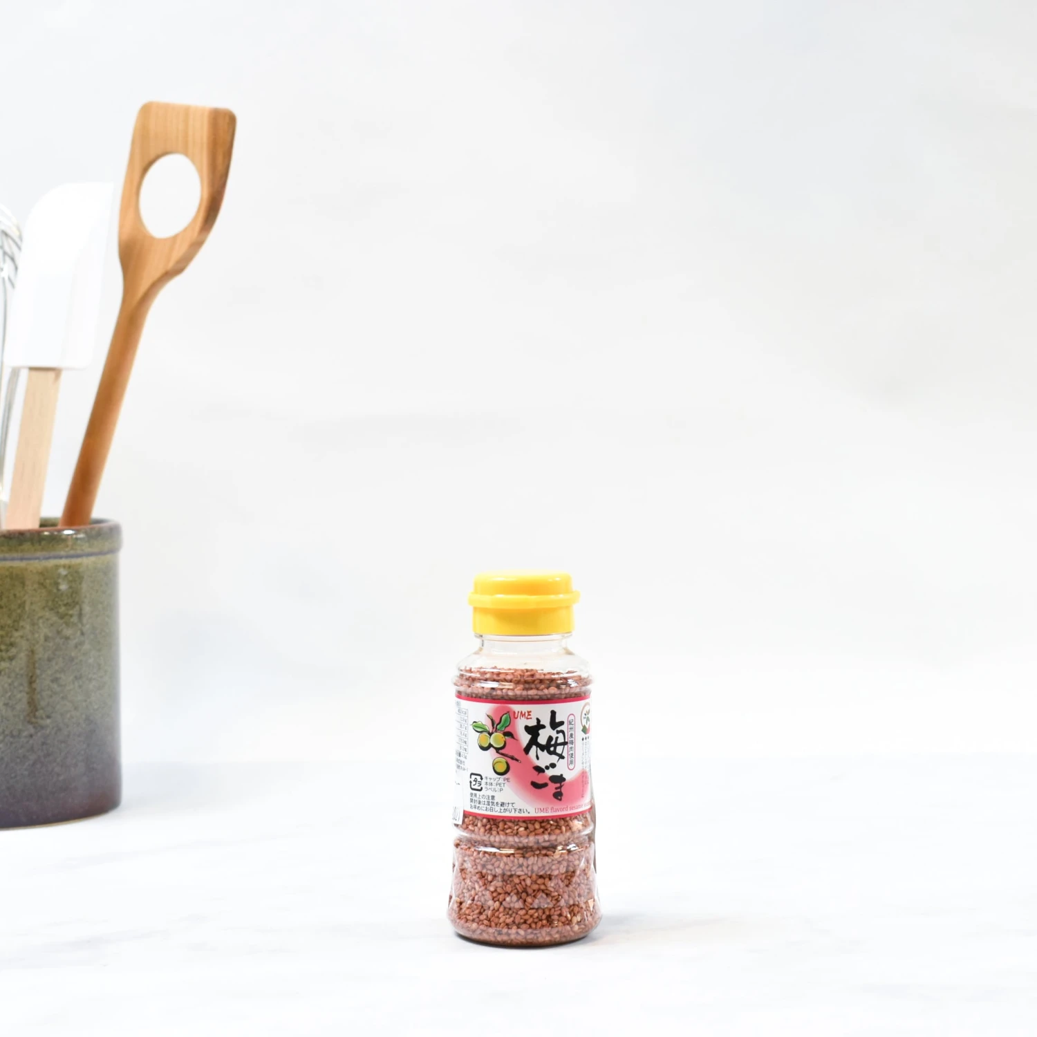 Ingredients: roasted sesame, salt, sugar, bonito extract, fermented seasoning, ume (Japanese plum), flavour enhancer (amino acid), acidulant, shiso flavouring. Contains allergens: sesame, fish.