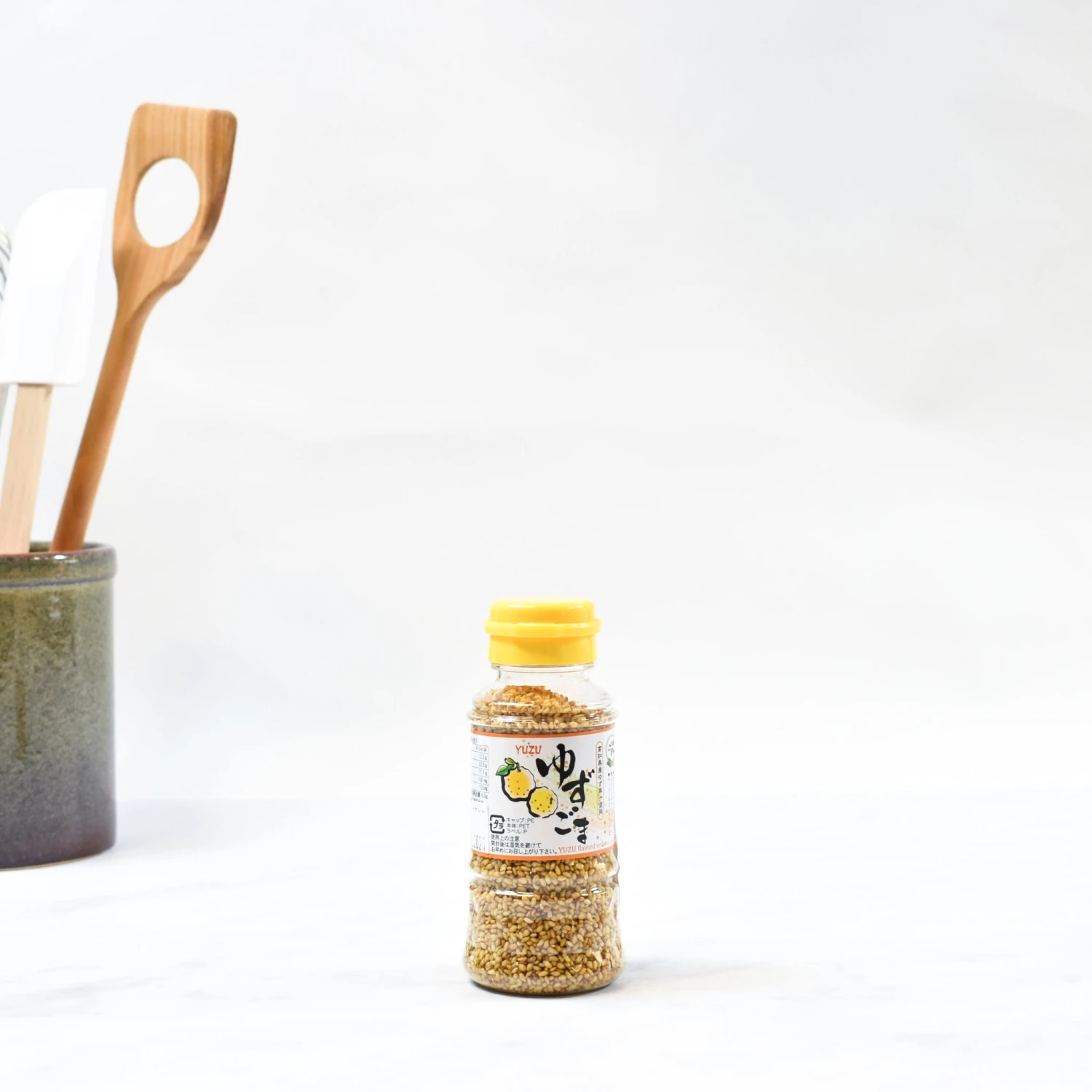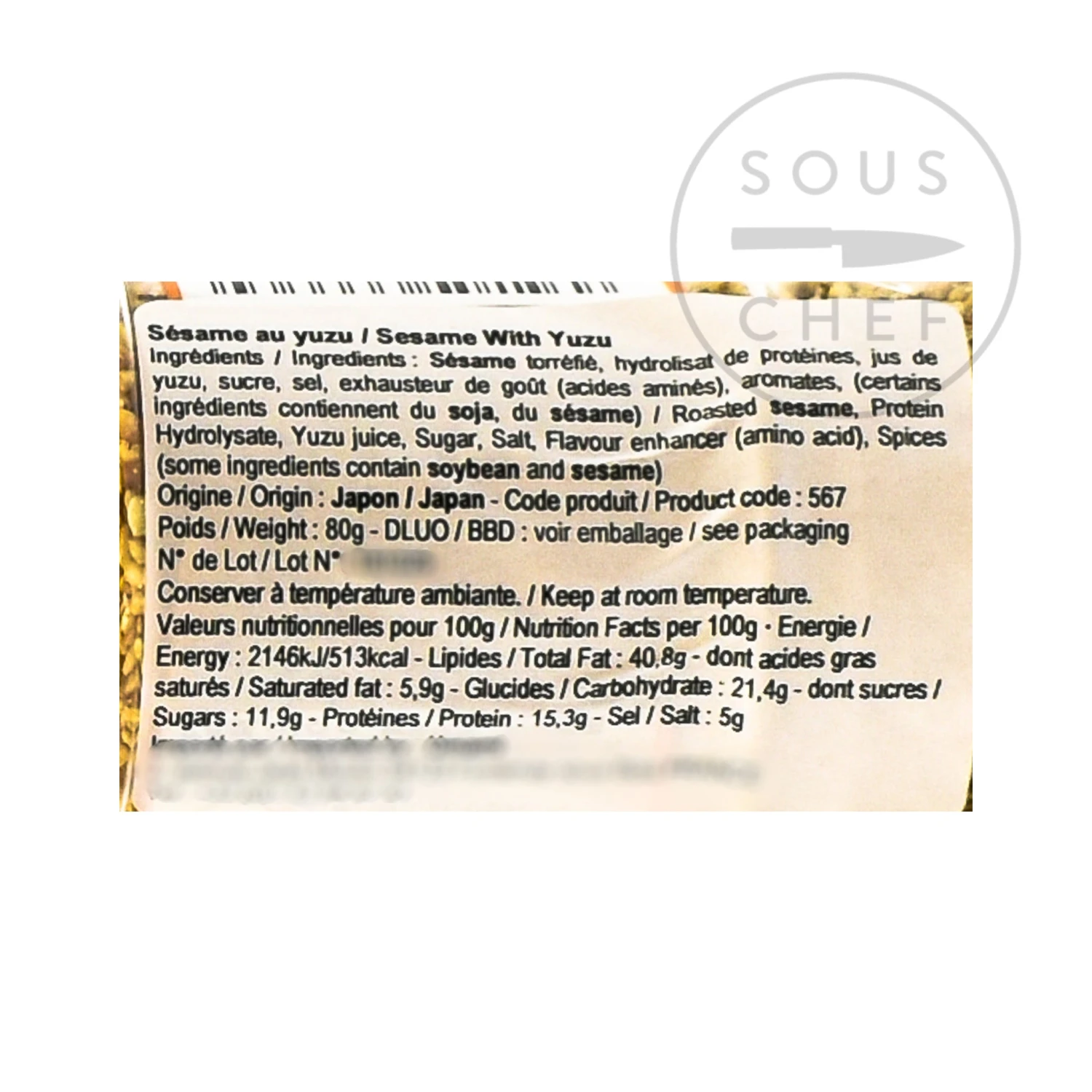 Ingredients: roasted sesame, protein hydrolysate, yuzu juice, sugar, salt, flavour enhancer (amino acid), spices. Contains allergens: sesame, soya.