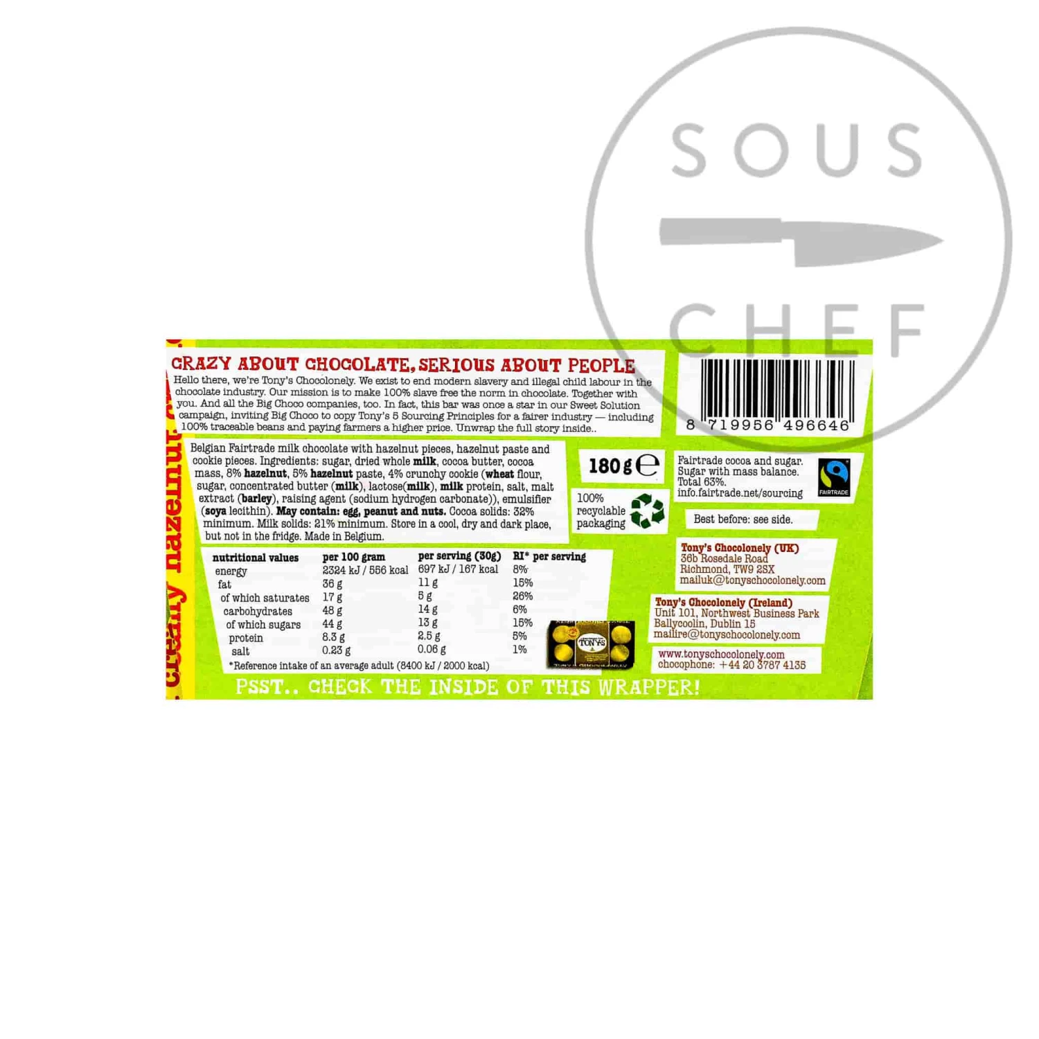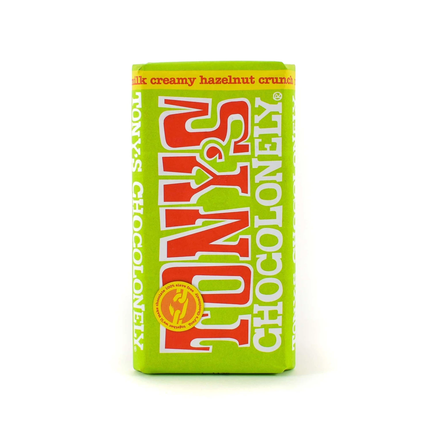 Tony’s Chocolonely milk creamy hazelnut crunch is a bar for nut lovers! With a nod to a Ferrero Rocher, smooth Belgian milk chocolate is paired with finely chopped hazelnuts, hazelnut paste and pieces of feuilletine biscuit.Â