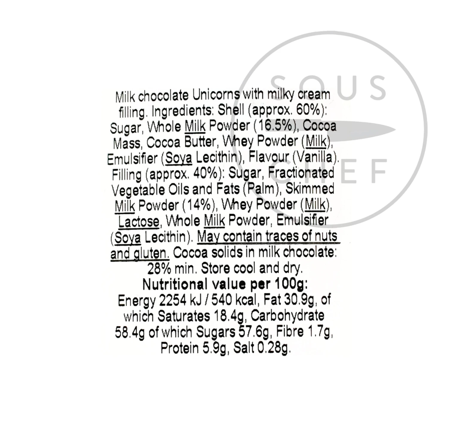 Ingredients: Shell (approx 60%): Sugar, Whole Milk Powder (16,5%), Cocoa Mass, Cocoa Butter, Whey Powder (Milk), Emulsifier (Soya Lecithin), Flavouring (Vanilla). Filling (Approx 40%): Sugar, Fractionated Vegetable Oils and Fats (Palm), Skimmed Milk Powder (14%), Whey Powder (Milk), Lactose, Whole Milk Powder, Emulsifier (Soya Lecithin). Cocoa Solids: 28% min.
