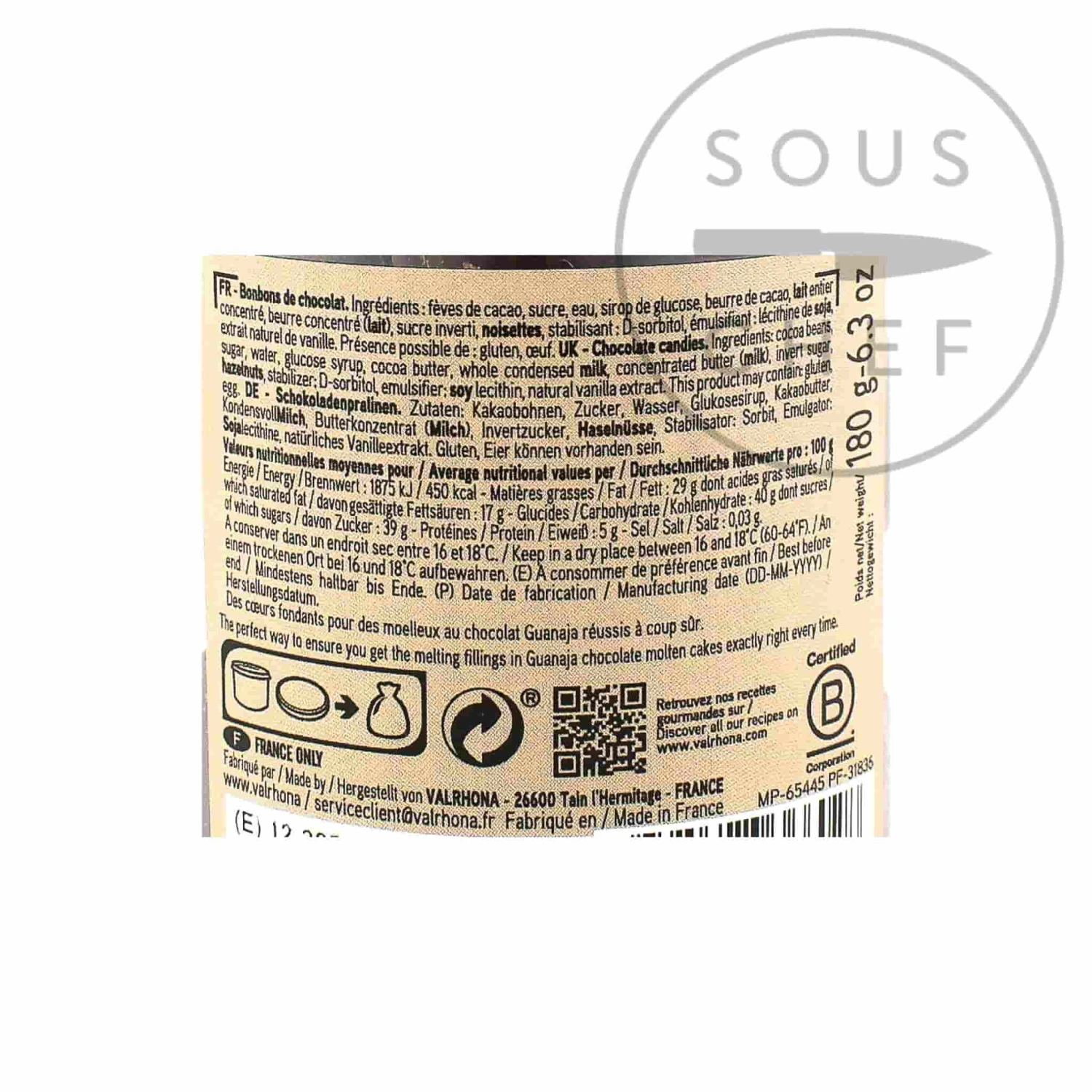 Ingredients: Cocoa beans, sugar, water, glucose syrup, cocoa butter, whole condensed milk, concentrated butter, invert sugar, hazelnuts, stabilizer: D-sorbitol, emulsifier (soy lecithin), natural vanilla extract.