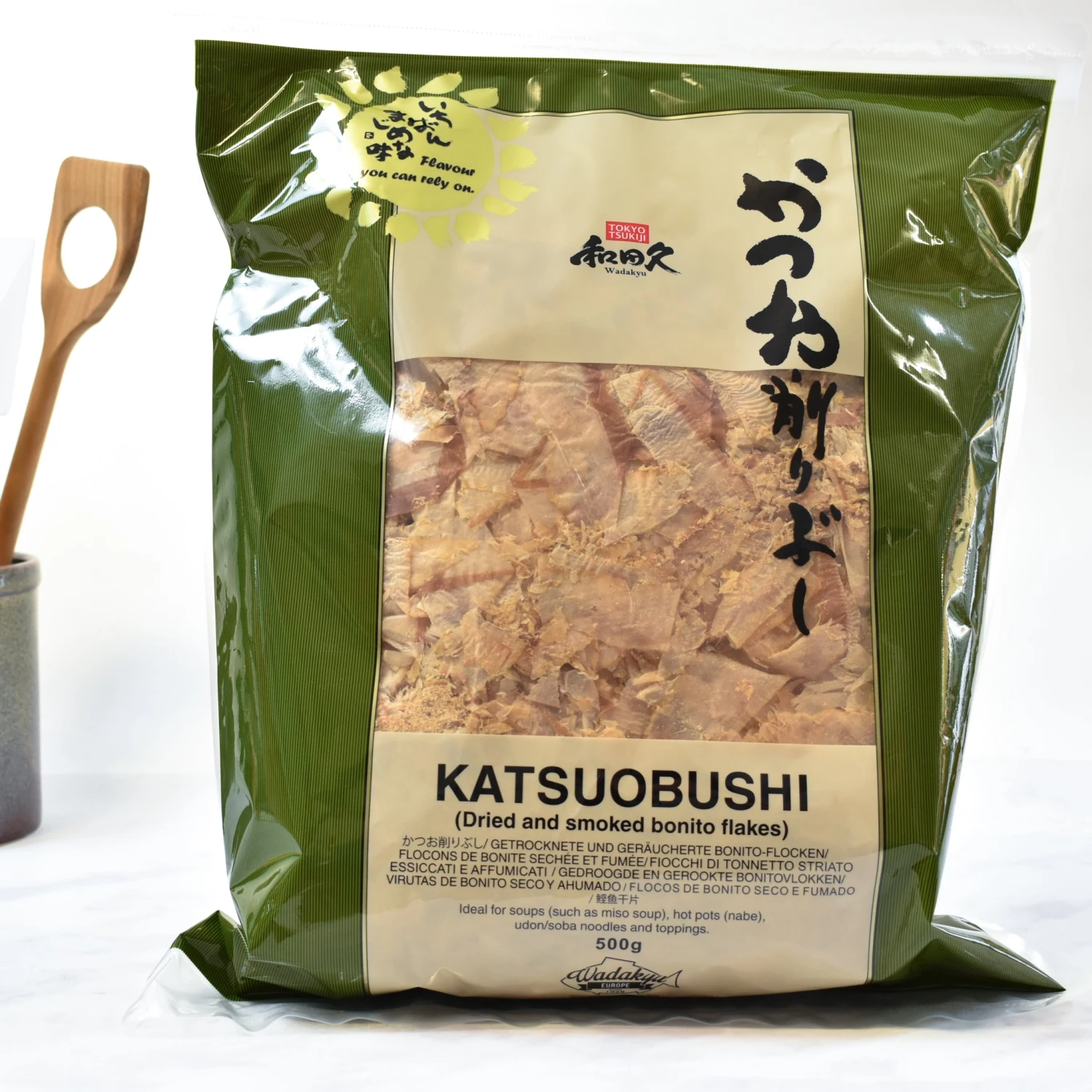 Katsuo Bushi bonito flakes, or katsuobushi, are tissue-paper thin fish shavings with intense umami flavours. They come from a tuna-like Pacific fish which is dried, fermented to wood-like hardness and then smoked. Use along with dried kelp to form the base of the Japanese stock dashi.