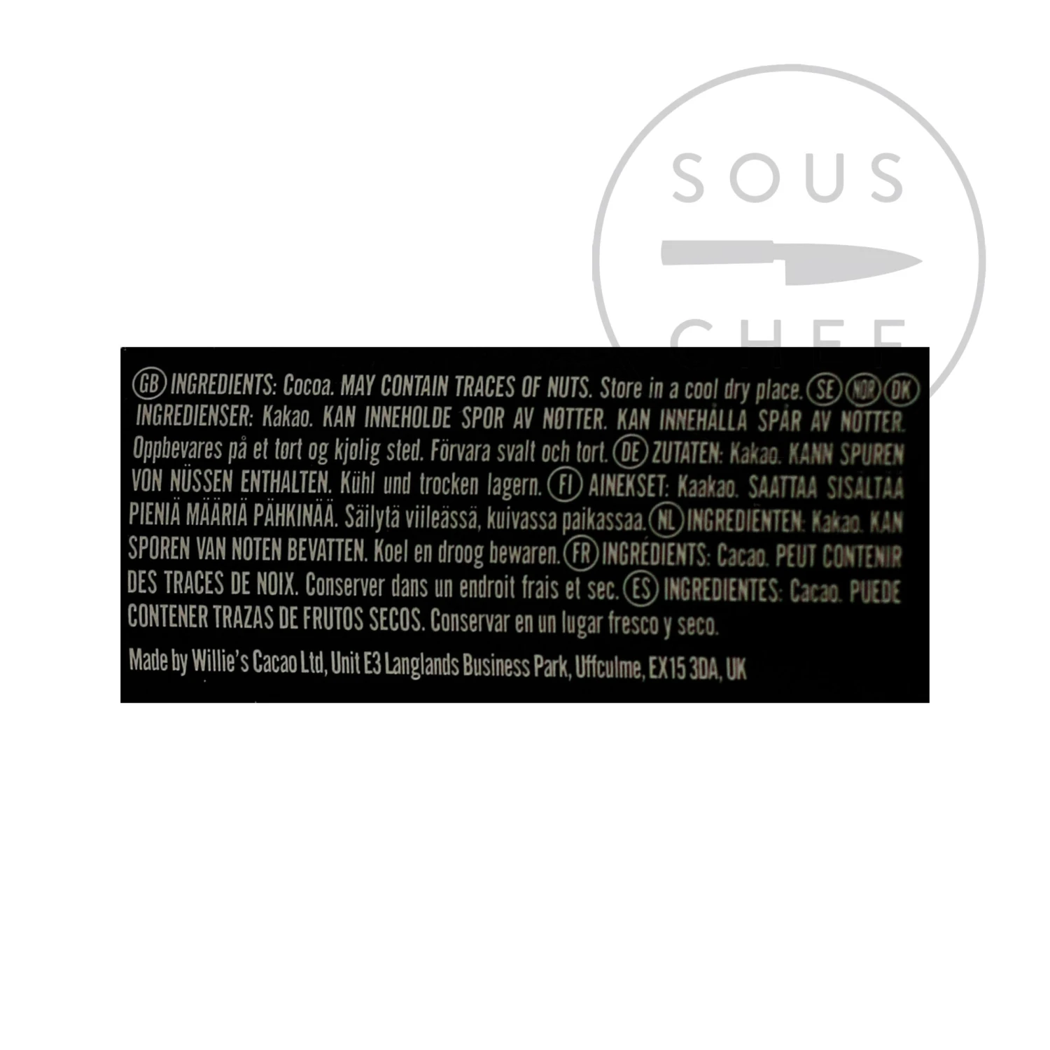 Willie’s Cacao Venezuelan black Rio Caribe 100% cooking chocolate adds intensity to gravies, casseroles and mole sauces. 100% pure cacao, it has complex nut and coffee notes. Grate this single-estate chocolate block into rich, meaty dishes, or use shavings to decorate indulgent chocolate cakes.