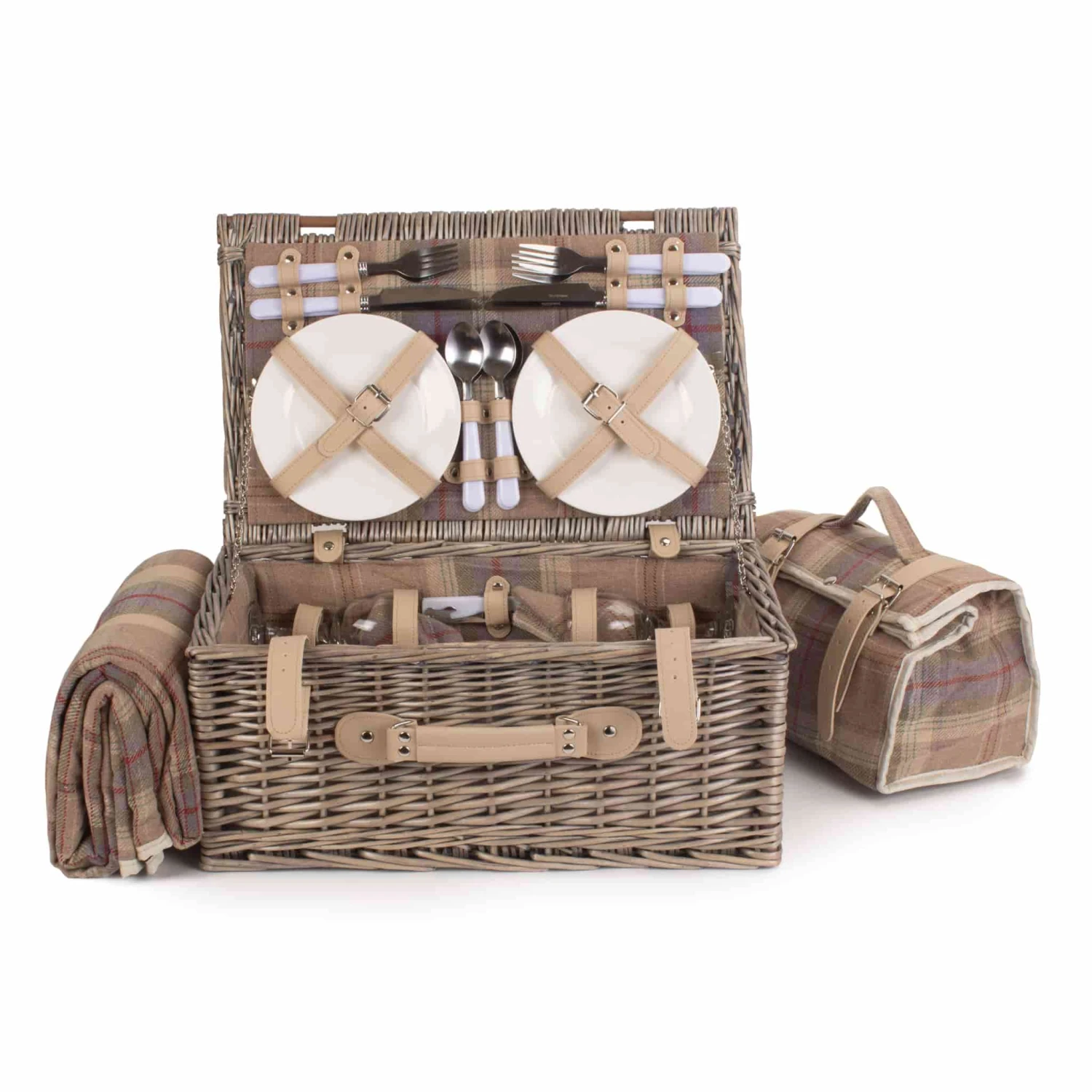 Use the lavender tartan picnic hamper for four to feast al fresco all summer – just add the food! Crafted from willow, this traditional picnic hamper has smart cream faux leather straps and a lavender tartan lining. Plus, the side handle makes this hamper easy to carry, whether you’re travelling by car, train or on foot.
