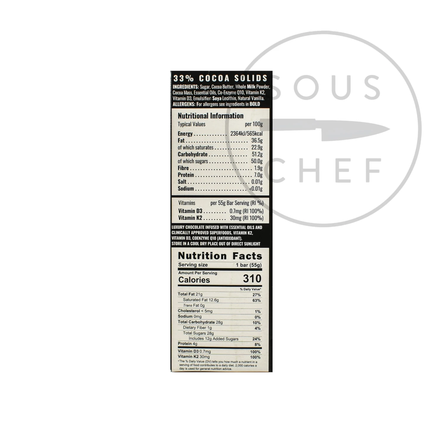 Ingredients: Sugar, Cocoa Butter, Whole Milk Powder, Cocoa Mass, Essential Oils, Co-Enzyme Q10, Vitamin K2, Vitamin D3, Emulsifier: Soya Lecithin, Natural Vanilla