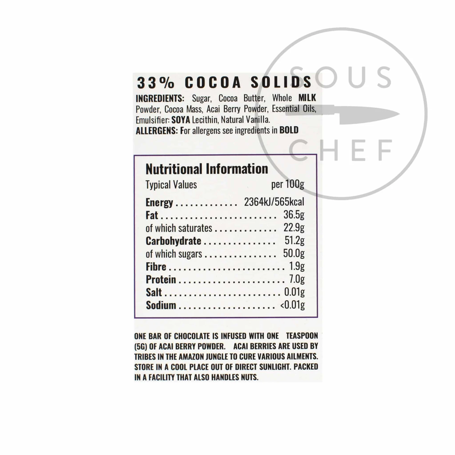 Ingredients: Sugar, Cocoa Butter, Whole Milk Powder, Cocoa Mass, Acai Berry Powder, Essential Oils, Emulsifier: Soya Lecithin, Natural Vanilla.