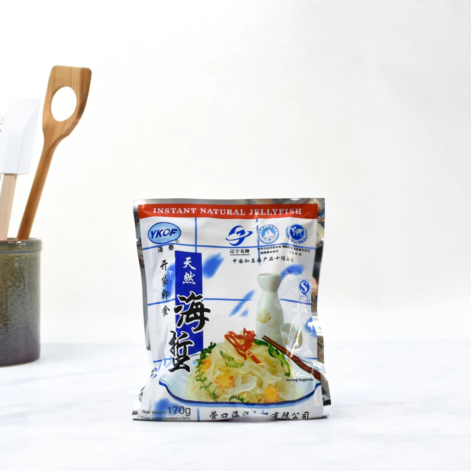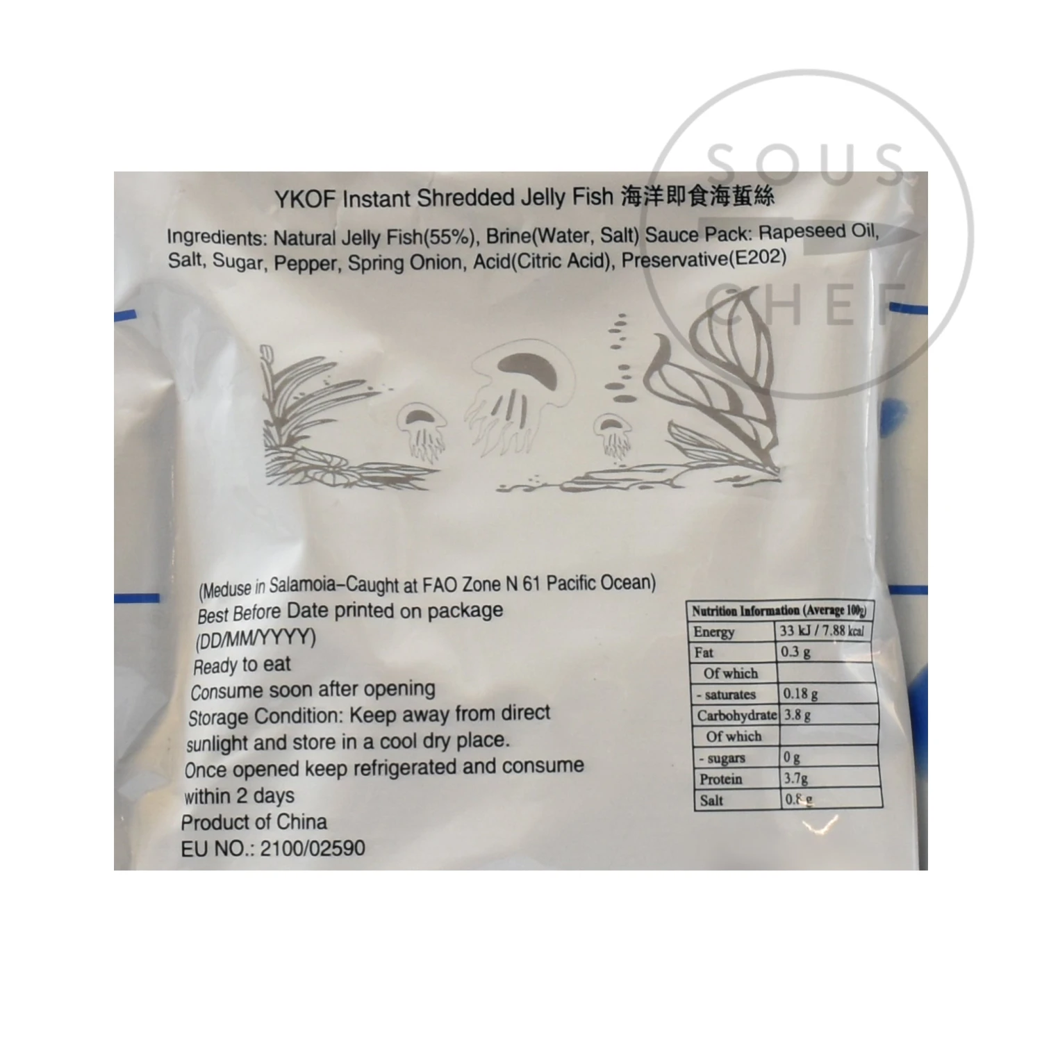 Shredded jellyfish is a popular Chinese starter or snack. Jellyfish has a highly prized texture, but very little flavour – this instant shredded jellyfish it is perked up by a sachet of a tangy dressing, and is excellent served with shredded cucumber and poached chicken. To serve, rinse the shredded jellyfish in cold water before mixing it with some shredded cucumber and the dressing.Â