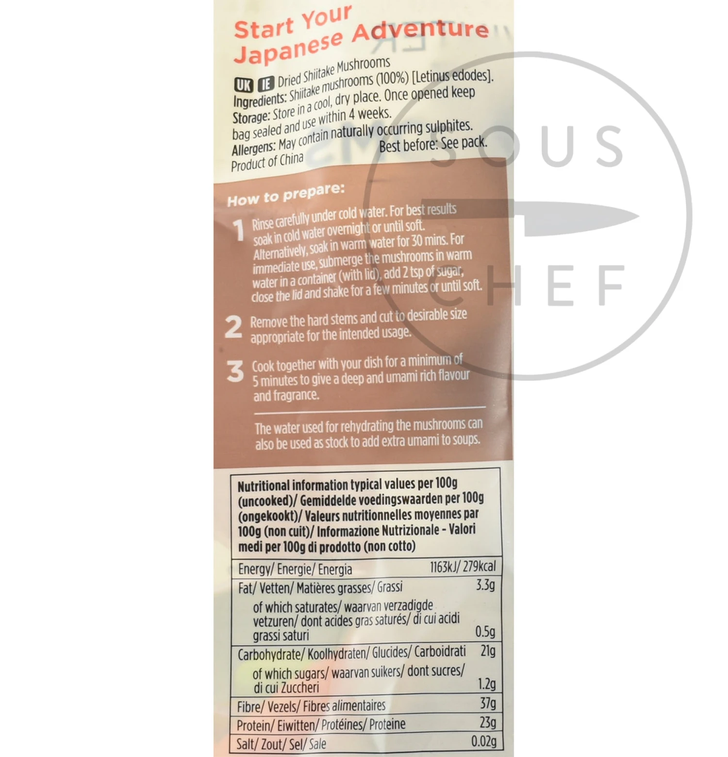 Ingredients: Dried Shiitake mushrooms (100%) (Letinus edodes). May contain naturally occurring sulphites.