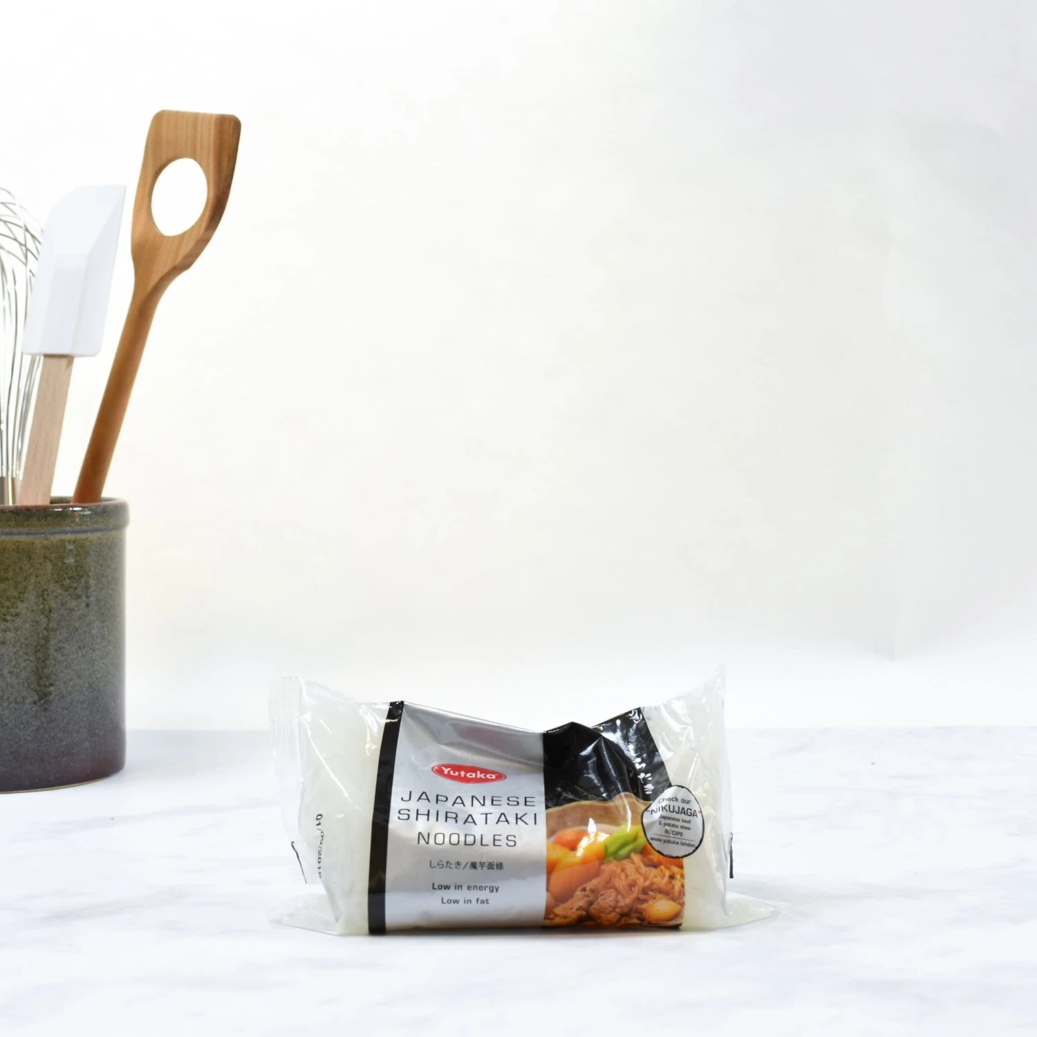 The low calorie shirataki noodles come packaged in water, so drain and rinse before using. They do not need cooking, but simmering for just a few minutes before using changes the texture slightly and heats them through – we prefer it like this. Each packet of shirataki noodles serves 1.